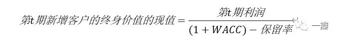 但是,分子必须是分母的子集,也就是说,要把当期新增的客户从分子中剔除掉。与保留率相对的是“损耗率”,等于1减保留率。那么,要想计算第N期的客户,到第M期还剩下多少,只需要将第N期开始的客户数量,乘以即可。假如第1期客户数量是100,保留率为0.9,第2期,老客户数量就是90,第3期又会流逝9位客户,只剩下81位,整体呈现指数衰减轨迹。对企业来说,肯定是保留率越高越好,所谓服务创造价值,瞄准的就是客户的黏性,它可以提高保留率。前文讨论创新扩散的S型或者鞍型曲线,目的是想预测每一个时期创造的客户数量。但是,客户对公司的价值,并非只局限于当期。极端情况下,如果保留率等于1,那就意味着,每一期新创造的客户在将来各期仍将创造利润。所以,第期新创造的客户价值的计算公式为(未贴现):![]()