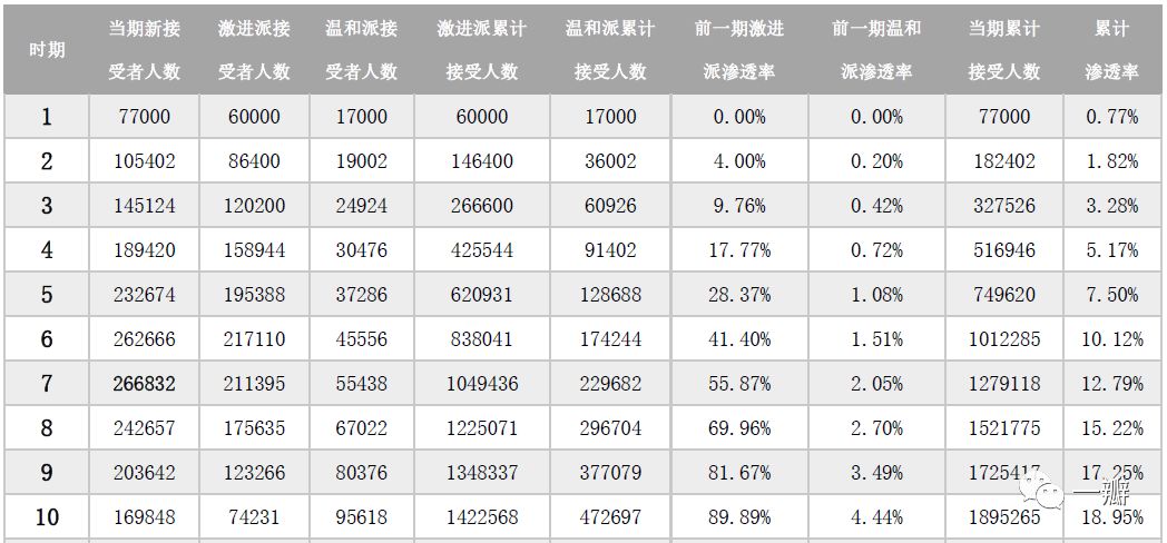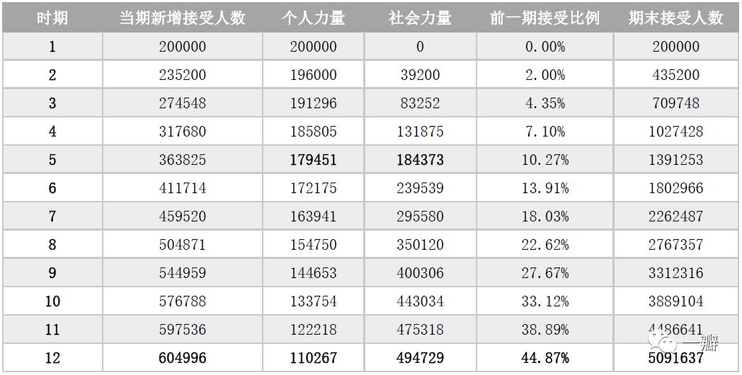 在公式(5)中,𝑛𝑡就表示第t期新增感染者,它等于经过外部渠道和内部渠道感染的人数之和,分别等于(𝑀−𝑁𝑡−1)×𝑝和(𝑀−𝑁𝑡−1)×𝑞×𝑁𝑡−1/𝑀,前者理解起来相对容易,即本期未被感染的人数与经外部渠道传,前者理解起来相对容易,即本期未被感染的人数与经外部渠道传染的可能性的乘积;对于后者,多了一个刻画内部渠道强度的内容,由𝑁𝑡−1/𝑀来表示,即本期之前已感染者比例,比例越高,内部渠道的影响力就越大。这一点也很容易理解,在病毒传播过程中,随着感染者比例的提高,哪怕一个人只传一个人,每一期新感染者的数量也会递增。当然,也会出现拐点,因为一旦所有人都感染了病毒,病毒就无法继续扩散了。由此可见,创新产品的扩散与流行病毒的扩散的基本原理是一致的。那么,第t期的累计市场渗透率(𝐹𝑡)就可以被表示成𝑁𝑡/𝑀,第期新接受者的比例(𝑓𝑡)可表示为𝑛𝑡/𝑀,它等于𝐹𝑡−𝐹𝑡−1,即第t期的累计市场渗透率减去前一期的累计市场渗透率。用公式可表示为:所以,只需要知道三个参数,就可以推导出新产品在不同时期的扩散情况,以及市场渗透率情况。假如:那么,该如何预测𝑛𝑡、 𝑓𝑡、 𝑁𝑡、 𝐹𝑡,又如何将其拆分成个人力量和社会力量?运用递推公式(5),我们就可以回答这些问题。比如,对于第1期而言,尚未接受的人群总数为1000万,前一期接受的比例为0,第1期新增接受的人数就等于10,000,000×(0.02+0.2×0)=200,000 ,第1期累计接受人数也是20万,而且全都是通过个人力量传播的;同理,第2期新增接受人数为:其中,个人力量为196000,社会力量39200,期末累计接受人数435200。以此类推,可将前40期的扩散情况表示成表1。表1有几个值得注意的现象,结合图5可以看得更清楚。第一,累计接受人数沿着标准的S型增长轨迹扩散,当期新增接受人数呈倒U型,扩散速度先增加,后递减,第12期达到高点,新增60.5万。截至第12期,累计渗透率已经超过了50%,到第21期,渗透率就超过了90%;第二,在整个扩散的过程中,从贡献率上来说,个人力量趋弱,社会力量趋强。前4期,个人力量占主导,第1期是绝对主导,因为在此之前,已接收人数占比为0。从第5期开始,社会力量占主导,其最高点出现在第13期。至第40期,累计接受人数达到了9,990,100,渗透率为99.87%,其中,个人力量贡献了25.9%,社会力量贡献了74.1%。![]()