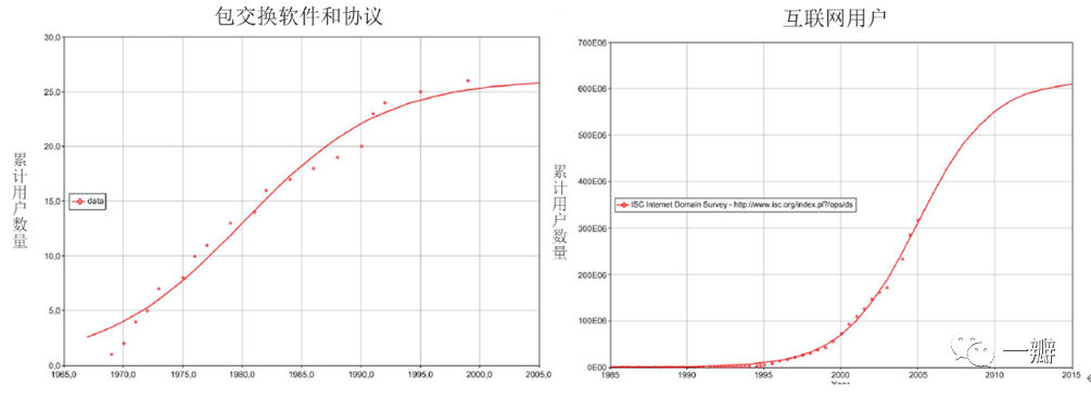 综合而言,个人力量越强,新产品引入期的扩散速度越快,而且,引入期建立的客户群基础会加速增长期的到来。如果没有引入期的客户群基础,社会力量再强,也需要等比较久才能发挥,增长期的到来将会显著延迟。通过比较场景1和场景5的S型扩散曲线(参考图6),能够更清楚的看出个人力量的作用。在场景5中,个人力量参数为0.002,仅为场景1中的10%。可以看出,前期扩散的速度非常慢,增长期显著延迟,直到第17期,新产品市场渗透率仍低于20%,至第25期,渗透率才超过50%。从图7中对个人力量和社会力量的分解也可以看出,场景5中的个人力量非常弱,这与社会力量峰值的延迟是紧密相连的。但是,个人力量的大小不仅仅取决于个人力量参数的绝对值,还取决于其与社会力量的相对大小。这可以从场景1与场景3的对比中看出。两个场景的个人力量相等,但场景3的社会力量仅为场景1的一半。首先,从图6可以看出,相对于场景1,场景3的扩散整体较慢,但增速较为均匀,增长期和引入期扩散速度的差异没有场景1显著;其次,从对两种力量的分解可以看出(图7右上角),虽然两个场景的个人力量参数相等,但并不等于说,两个场景的个人力量扩散曲线是重合的,说明个人力量与社会力量是相互依存的关系。个人力量参数相同,仅仅意味着两个场景有共同的起点。在整个扩散过程中,场景3的个人力量都高于场景1,这是因为,场景3中的社会力量更弱,留给个人力量的扩散空间也会较大。比较场景1和场景3中的社会力量参数,也能够得到有意思的结论。无论是从绝对意义上,还是从相对意义上,场景3的社会力量参数都小于场景1,但其相对于场景1的社会力量扩散曲线,在不同时期,却有不同的表现。在引入期和增长期,场景3的社会力量的扩散效果都明显较弱。但是,正是由于前期扩散速度慢,反而在后期,场景3的社会力量超过了场景1。所以,社会力量主要表现为一种爆发力,社会力量越强,增长期爆发力就越强,在S型扩散曲线中,主要体现为快速上升期的斜率的陡峭程度。从前文的分析可知,个人力量与社会力量是相互依赖的,个人力量增强有助于使社会力量的影响前置,新产品将会以更快的速度扩张(场景2),反之,如果社会力量更强,一旦进入增长期,其扩散的速度就会更快。相对于场景1而言,场景4的个人力量更强(增加1倍),社会力量更弱(50%)。从图6中的S型累积扩散曲线可以看出,场景4在前期扩散更快,后期扩散更慢。从第15期开始,场景1的渗透率反超场景4,并一直维持到最后。从图6可以看出,场景4的个人力量始终强于场景1,只是在扩散过程中,两者的剪刀差在不断缩小,但是,由于社会力量的剪刀差以更快的速度递减,从第26期开始,场景4的社会力量反而超过了场景1。两种力量对比的变化,最终导致渗透率出现了交叉。由此可见,虽然场景4的社会力量参数较小,但这并不意味着,在整个过程中,社会力量都弱于场景1。在场景4中,个人力量参数更大,其扩散曲线始终在场景1之上,但这并不等于说,只要个人力量参数大就有这样的特征,对比场景1和场景2来看,虽然场景2的个人力量参数也为0.04,但其与场景1的个人力量曲线同样也出现了交叉。由此可见,个人力量和社会力量参数的相对大小决定了扩散速度在时间上布局,从而也决定了创新产品扩散的S型曲线和生命周期的形态。个人力量直接作用于引入期的扩散速度,当然,对社会力量也会产生间接影响。个人力量越强,就能越快地建立坚实的客户基础,从而导致增长期迁移。社会力量直接作用于增长期的扩散速度,它体现在增长阶段的斜率上。社会力量越大,斜率越大。社会力量对个人力量的间接影响主要是通过潜在接受者人数实现的,社会力量越强,增长期速度越快(持续时间也会越短),从而对个人力量影响的空间形成挤压。对照图3中苹果产品的例子来看,Iphone和Ipad在发行之初增速就很快,故个人力量就比较强,而Mac和Ipod都经历了比较长、且比较平缓的引入期,个人力量相对较小。进入增长期后,Iphone的扩散曲线比较陡峭,说明社会力量和示范效应也很强。诺奖得主弗里德曼认为,理论的正确性不是建立在假设条件的现实性上,而在于理论的预测能力。对创新扩散模式的抽象,目的也是预测。图8显示了包交换软件和协议与互联网的扩散,散点是实际数据,实线是模拟数据,可以看出,S型扩散曲线有较强的拟合性。欧菲克等(2016)对CD播放器、文字处理器、手机等许多创新产品都做了类似的拟合,发现S型扩散模式都可以很好的拟合新产品上市后的实际数据。![]()