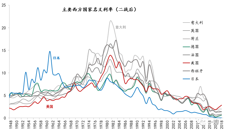 两次石油危机期间,西方国家普遍经历了滞胀,由于通胀率超过了名义利率,实际利率出现负值,峰值在1974年,全球实际利率达到-5%,1981年开始,实际利率转正,到2017年再次转为负值,并延续至今。日本除外,其他7个西方国家的名义利率走势比较一致,峰值出现在1981年前后,而日本的峰值在1961年。下面以美国为例来说明战后利率长周期形成的原因。