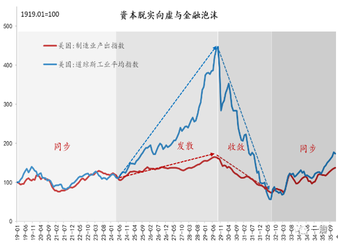 在技术革命的不同阶段,金融资本与生产资本的收益率会有一定的差异,这影响着资本在不同形式之间进行切换。在科技革命的引入阶段,新旧“技术-经济范式”(佩雷斯,2007)更替,大量创新资本会涌向新领域,创新和新的产业集群也因此而诞生,他们也将造就一批伟大的企业和属于那个时代的“科技新贵”。资本市场是为未来定价的,产业的繁荣必然带来估值的提升,而金融资本天然具有投机属性,当越来越多的产业资本转变为金融资本。资本脱实向虚的结果就是资产价格的上涨、泡沫和崩溃,脱虚向实的结果就是产业的扩张、产能过剩和企业间的兼并重组。在不断轮回的周期中,资本的分工会不断地进行着。每一次科技革命都是一次财富大爆炸,也必然体现在资产价格上。1897年前后,第三次工业革命也开始进入爆发期,钢铁、石油、电力和汽车等新兴产业开始形成。更为重要的是,美国是以中心国的身份开始了第三次工业革命。从1900年到1929年的30年间,美国GDP增长了2.7倍,按不变价格计算,年增长率为3.4%。这要归功于创新产品的扩散,大量新产品的销量年增长率达到了10%至30%,例如,粗钢在1885年至1900年间的年均增长率为12.5%,汽车在1910年至1925年间的增长率为22.4%,石油消费在1900年至1915年间的增长率为10.4%。此外,从1899年到1929年的30年间,电力消耗增加了31倍,无线电接收机产量增加了28倍。1925年之前,制造业生产指数与道琼斯工业指数的趋势基本保持一致,但在此之后,道琼斯指数的走势与工业生产指数开始背离,资本开始出现脱实向虚的倾向(图3)。通用汽车公司的股价从1925年的21美元上升到1928年的46美元,3年间涨幅超过100%;道琼斯工业平均指数从1925年初的120点开始攀升,1929年9月初达到380,涨幅超过20%,而制造业却在大萧条开始之前就出现了疲软的迹象。上世纪20年代中期到大萧条爆发,汽车产量都稳定在370万辆,粗钢产量稳定在490万吨(Hirooka,2006),即在大萧条之前,第三次科技革命中的代表性产业——铁、石油、电力、汽车的增速就已经出现了拐点。图3:美国制造业和采矿业增加值指数(1919-1946)![]()