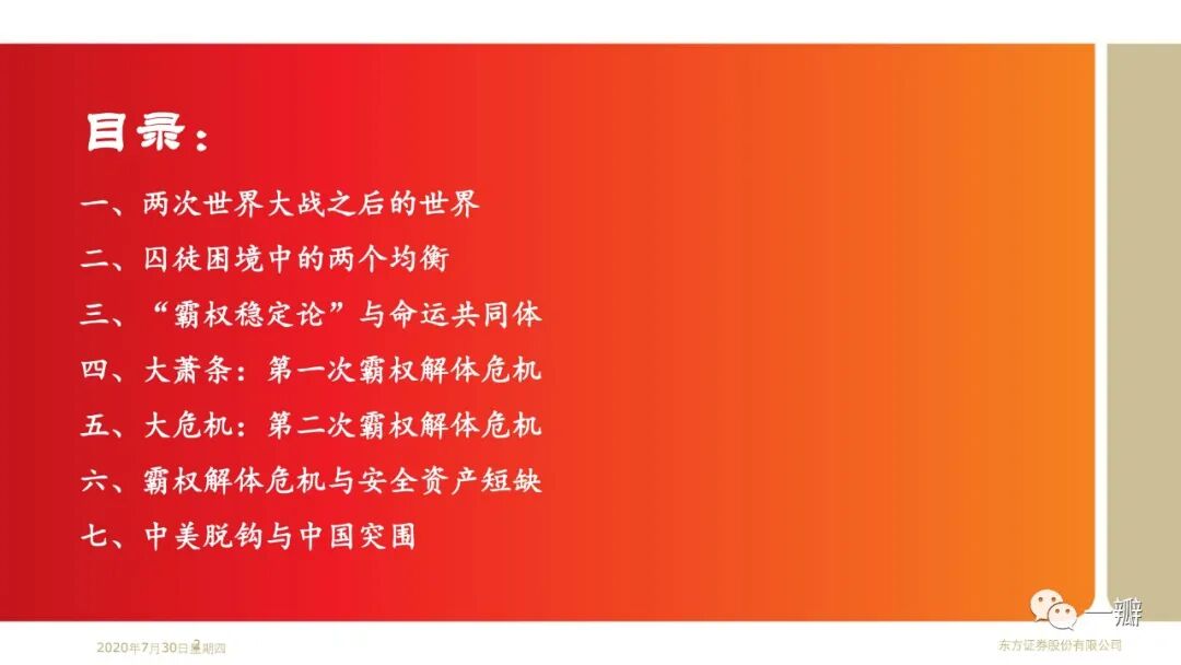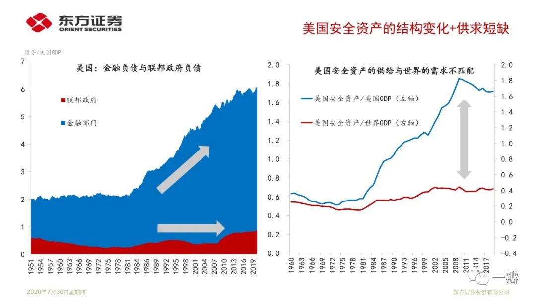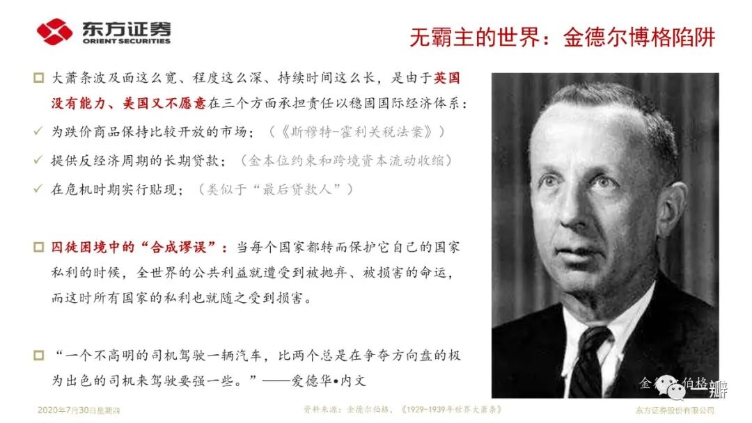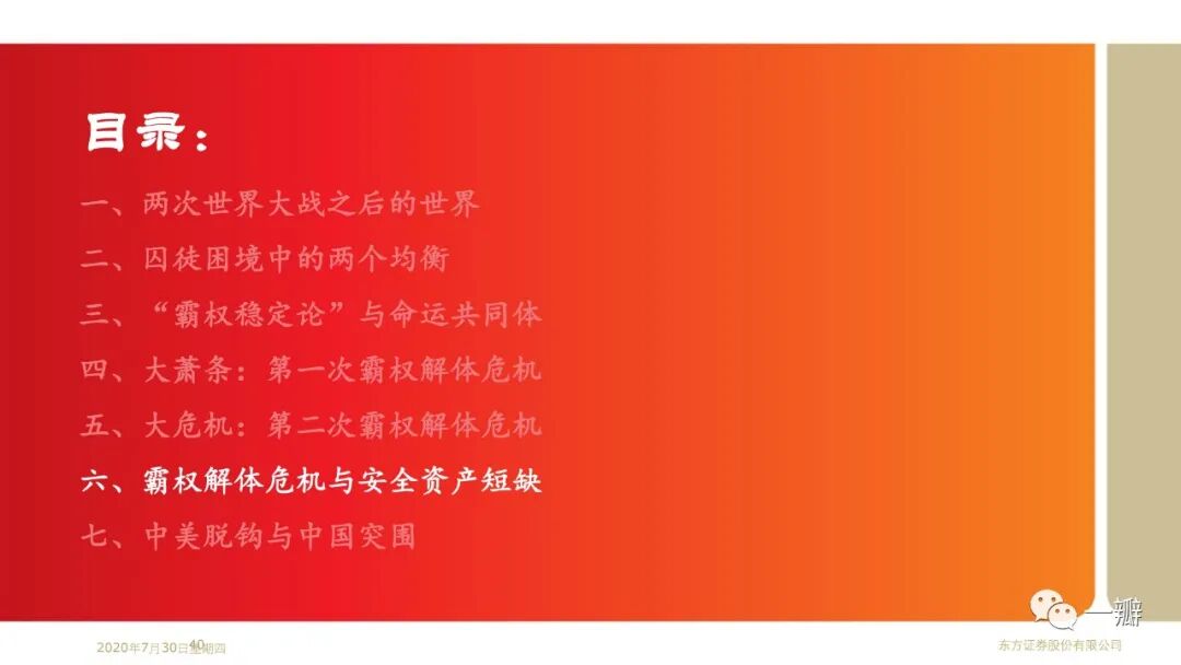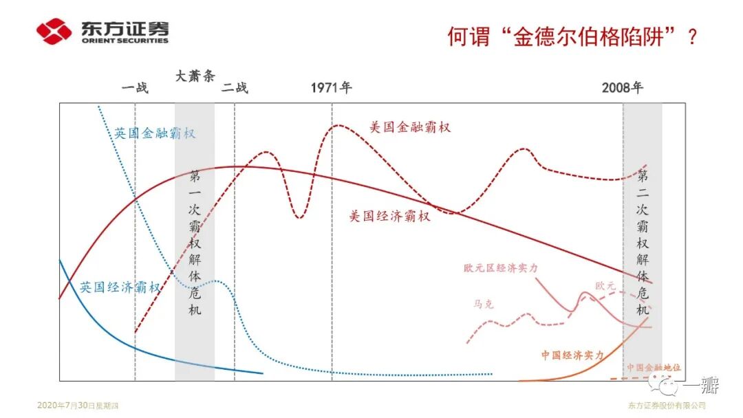 这是笔者基于“安全资产”专题延伸的思考。近20年安全资产短缺的特征事实反映的是单极化国际货币体系与多极化国际经济体系的矛盾;反映的是美国经济霸权衰落和金融霸权强势的矛盾。著名经济学家金德尔博格认为大萧条解释就是英美经济和金融权力不匹配的结果。国际政治学者约瑟夫·奈称之为“金德尔博格陷阱”。显然,2008年金融危机似乎也可以从这个角度来理解。当前世界经济面临的经济停滞、逆全球化、贸易冲突等问题,似乎都是霸权解体危机的表现形式。果真如此,那么,我们当前所处的阶段,或许还算不上至暗时刻。