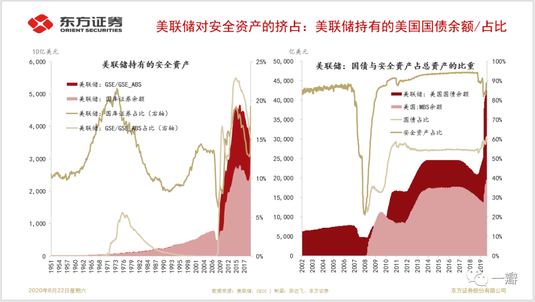 第一,随着量化宽松政策的常态化,美联储和欧洲央行持有的安全资产份额越来越大,对市场可获得的安全资产形成挤出。截至7月底(图8),美联储持有的美国国债余额达到了4.2万亿美元,为历史峰值,占美国国债总市值的比重约20%,与历史峰值持平。美联储购买GSE和GSE担保债券是金融危机之后的新举措,至7月底,余额约2万亿美元,创下历史记录,占总市值的15%,略低于2015年的3月的23%。与此同时,在美联储的资产负债表中,国债与MBS等安全资产在总资产中的比重也在不断刷新记录。按照德银的估计,至2021年初,美联储资产负债表规模还要扩张约两倍,也就是说,其持有的安全资产也将同步增长。除非美国国债同步等安全资产的供给同步增加,否则,安全资产短缺状况会更加严重。