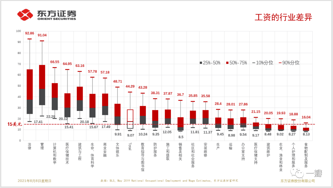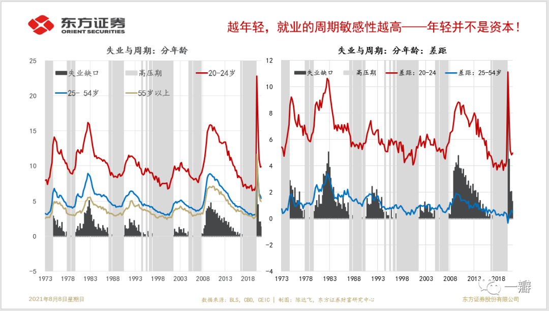 数据来源:Rose,2020.Brookings Institution,东方证券财富研究 分学历而言(图33),可得到类似的结论,高中肄业或高中毕业的弱势群体分布在贫困/准贫困阶层和低层中产阶级的比例显著高于高学历人群。与上世纪相比,就在中层中产及以上阶层分布的比例而言,高中肄业从35%下降至20%,高中毕业从65%下降至56%,大学肄业/准学士和本科及以上学历维持不变;但是,他们在高层中产及以上阶层分布的比例大幅提升,尤其是对于本科及以上学历人群。 图33:社会向上流动性的下降:按学历划分数据来源:Rose,2020.Brookings Institution,东方证券财富研究 劳动市场的不公平与劳动力市场是否处于充分就业状态密切相关。一个高压的劳动力市场兼具效率和公平两层含义(Aaronson等,2019)。奥肯早在1973年(Okun,1973)就提出,失业率从5%下降至4%不仅意味着有1%的劳动力资源得到了利用,还有助于社会向上垂直流动性的提升和全社会人力资本的积累。将所有弱势群体和优势群体放在一起进行比较,横轴是平均失业率,纵轴是贝塔系数,会呈现出一条斜率为正的直线——平均失业率和贝塔系数最高的三个弱势群体的排序为:非裔、高中肄业和西班牙裔;优势群体的排序为:研究生、大学本科和55-64岁群体[14]。这说明:弱势群体向优势群体的转变靠得是人力资本的积累——知识与时间[15]。 [1] Jared Bernstein是拜登经济顾问团队的一员。[2]非裔或西班牙裔的失业率-白人失业率。[3]即某个学院但未毕业。[4]与“本科及以上”学历的差。[5]小时工资(2020年美元,下同)。[6](23.0-19.2/19.2)*100%,(31.9-25.4/25.4)*100%。[7]控制变量包括:种族、民族、教育、年龄和地域划分。[8]数据参考EPI data library》[9] 2019年的工资(19.1美元)甚至低于1973年[10]按收入高低将劳动分为5组,每组人数占比20%。在收入最高的20%人群中,劳动收入占比约为62%,在其余4组中则超过80%。[11]阶层划分的依据是收入水平,可参考Rose,2020。[12]低层中产阶级的比例为37%,升至中层中产的比例为6%;[13]低层中产26%,中层中产8%,高层中产1%。[14] Wolfers,2019. Comment on “Okun Revisited: Who Benefits Most from a Strong Economy?”[15]对于本科以上学历者,时间是“值钱的”,单位小时工资会随着年龄的增长而增长,反之,对于高中及以下学历的就业者,工资随年龄增长的趋势并不明显(Nunn,2019)。从这个角度来说,知识比时间更有助于阶层的跃迁。