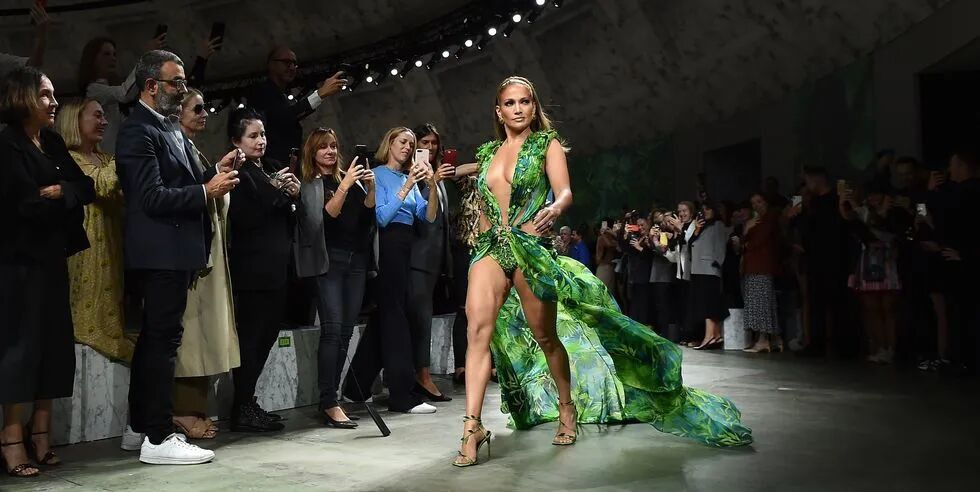 Jennifer Lopez在Versace2020年春季时装秀场中获得了现场观众最大的欢呼声。重现了2000年在格莱美颁奖礼上穿着的那件标志性的绿色礼服,为当天的秀场留下了浓墨重彩的一笔。以女王的姿态睥睨全场,独一份的自信是模特都无法比拟的加分点。
