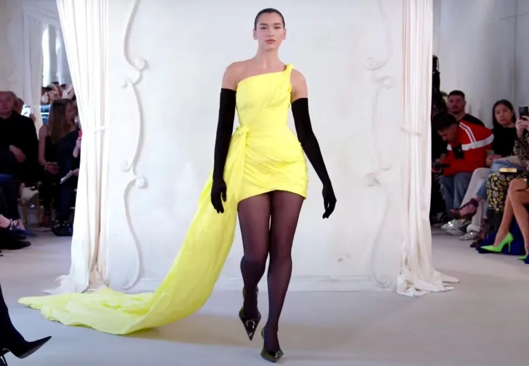 平时一直在社交媒体上展现时尚敏锐度的歌手Dua Lipa身着亮黄色迷你裙和黑色丝袜,将秀场变成了自己的舞台。