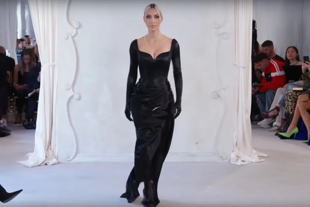 这是Kim Kardashian在秀场上的初次亮相,就十分幸运的登上Balenciaga高定系列秀场。她身穿深V黑色礼服,戴着内置手套走上T台。