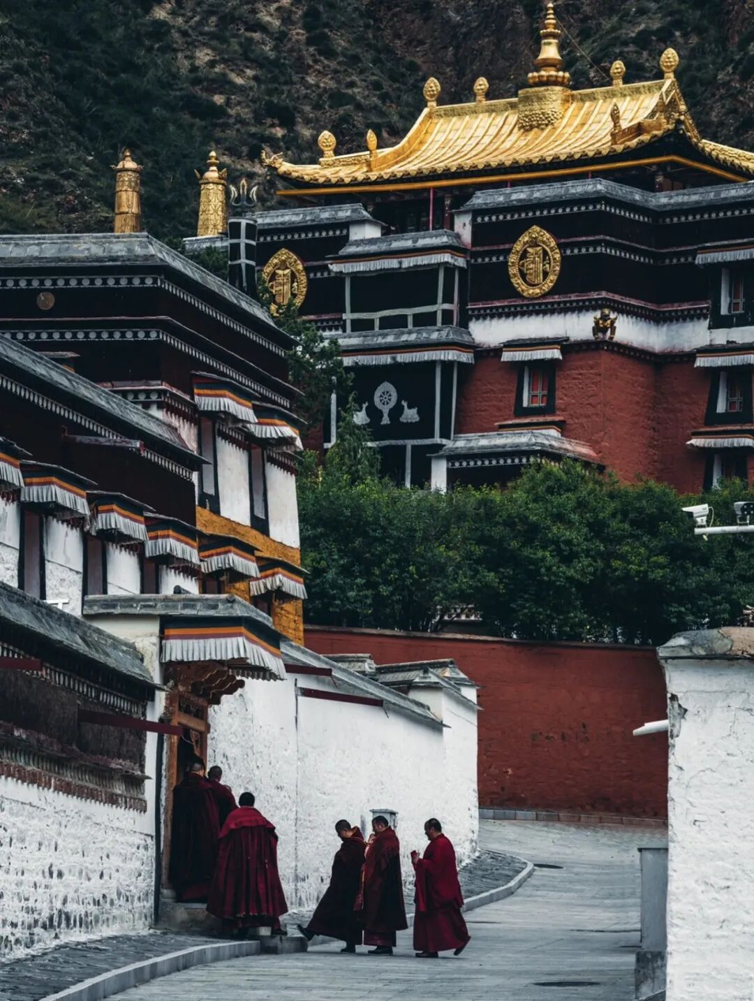 在藏族寺庙内,随处可见红色调,大胆的用色且保留风烛感的外墙增加了粗旷的气息,成为了藏地的特色代表。