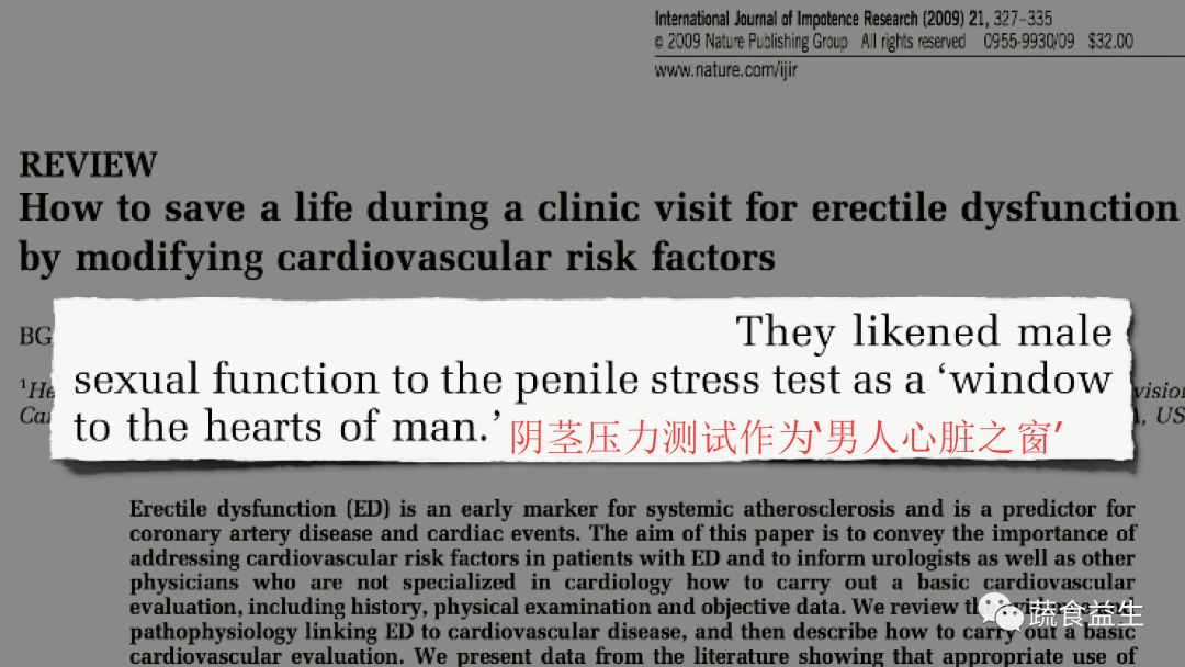 “男性性功能就像阴茎压力测试......,是一个'男人心脏的窗口'。”(译注:“阴茎压力测试”是相对于“心脏压力测试”的一种幽默的说法)