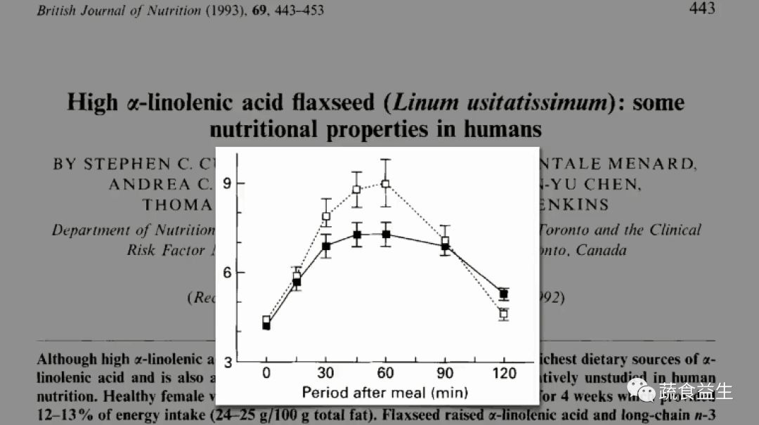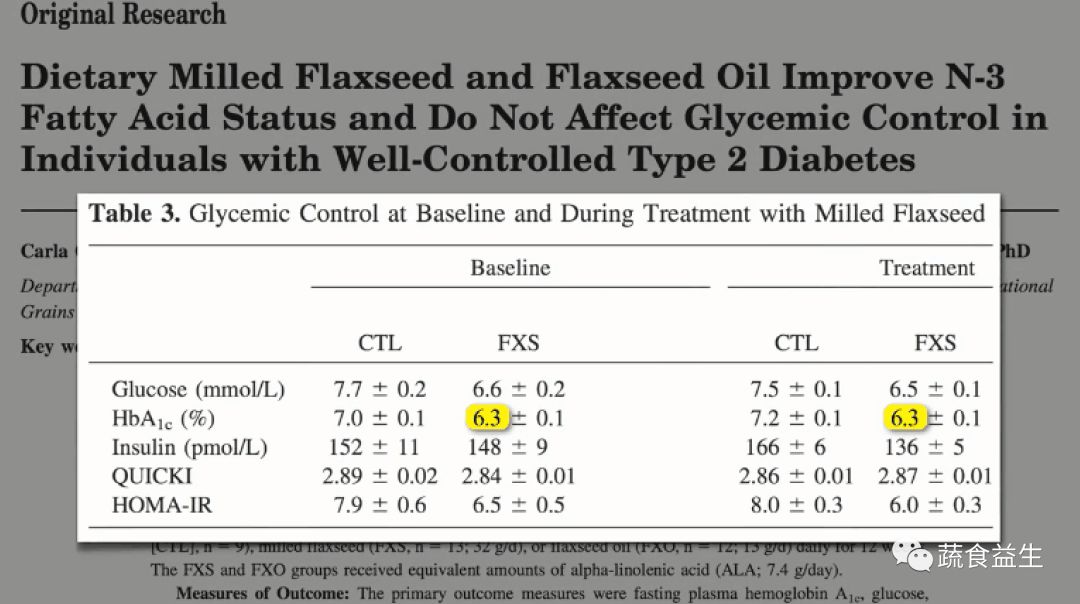 “一项关于亚麻籽粉...补充剂在糖尿病治疗中的作用的公开研究......(译注:公开研究是临床研究的一种,研究人员与参与者均知道研究的目的,与单盲和双盲不同。)” 每天一勺亚麻籽粉一个月,并且与对照组相比,空腹血糖显著下降,甘油三酯和胆固醇 — 以及最重要的是,A1C水平下降。