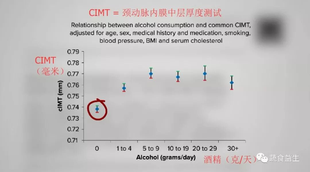 所以通过摄入酒精来提高HDL的方式或许没有作用,如果你关注动脉粥样硬化的亚临床标志,比如颈动脉血管壁的增厚程度,你会发现那些完全戒酒的人似乎患病风险最低,这在冠状动脉钙化评分上也一样,一般摄入酒精越少,患病风险即越低。