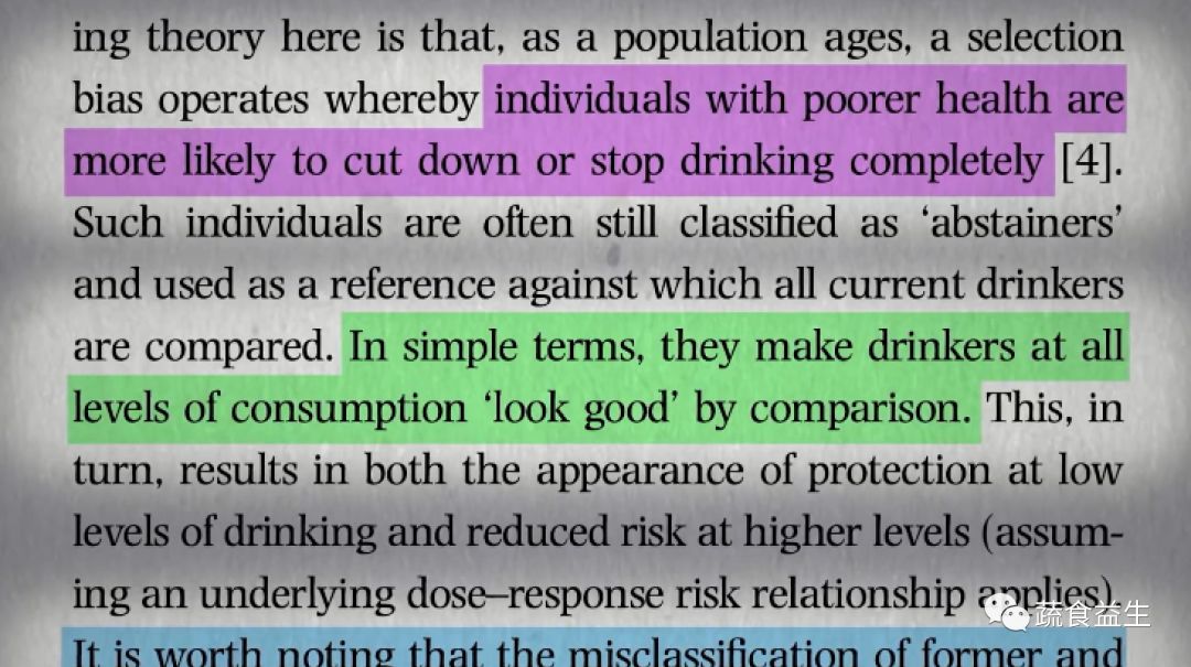 瞧,健康状况欠佳的人更可能减少饮酒量或完全戒酒,从而使当下的饮酒者相比起滴酒不沾者看起来更健康,原因就是一些戒酒者正是因为自己生病了才选择放弃饮酒的。