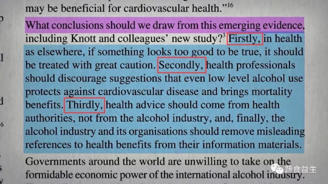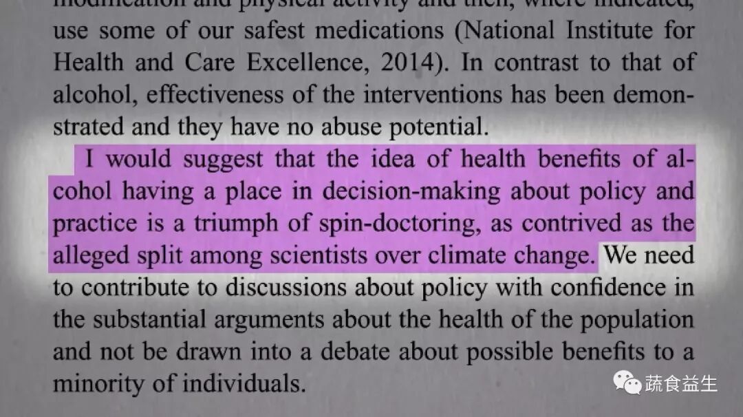第三,健康相关建议应来自卫生部门,而不是酒精行业,从而应该去除所有具有误导性的支持酒精有益健康的资料,这些资料看起来更像是公关专家的战绩而非权威科学的胜利,就像石油工业所推动的科学家在气候变迁方面的所谓分歧一样。
