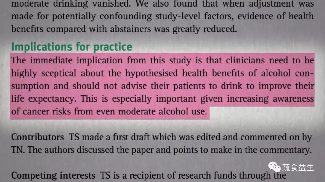 这项新研究的直接意义是临床医生需要高度怀疑其假设的饮酒所带来的健康益处并且不应建议其患者通过喝酒来延长寿命。