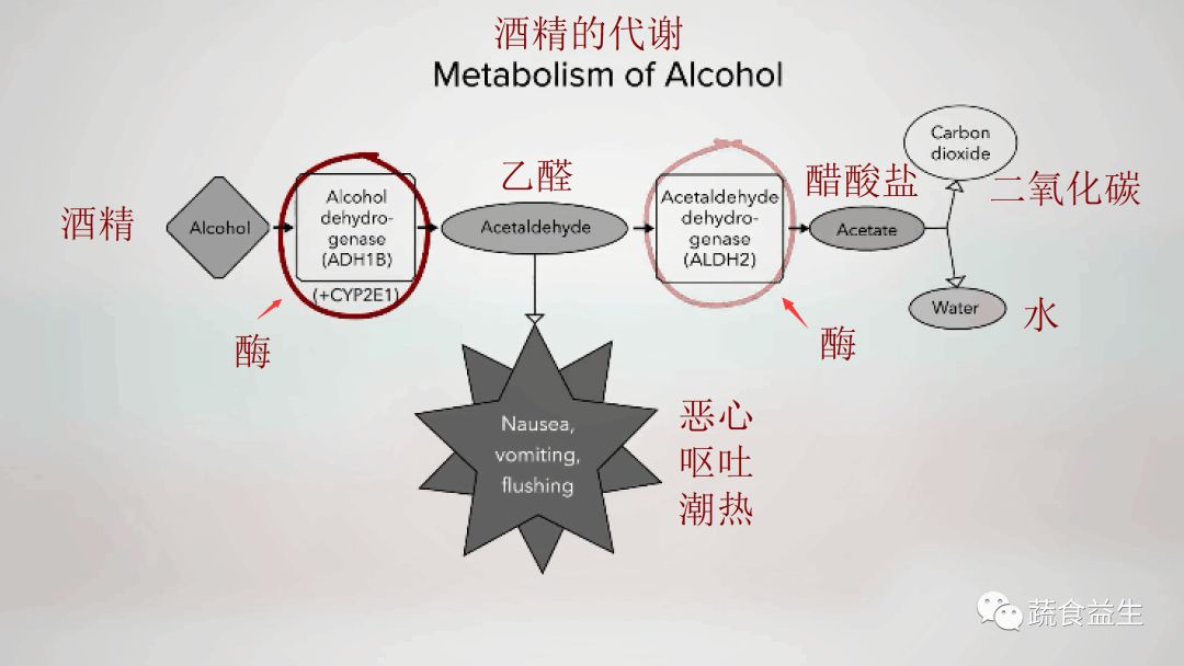 酒精在肝脏中被两种酶分解成二氧化碳和水,但在此过程中将会产生一种有毒的中间代谢产物,即可能引起不愉快的恶心感和潮热感的乙醛。