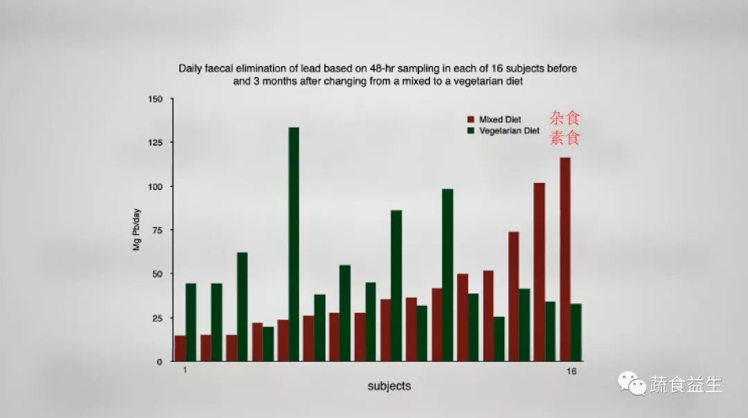 随着饮食改变为素食我们似乎能透过排便排出更多的铅,研究中有九位实验对象的铅排出平均提升了三倍,有三位未受影响,有四位下降了大约一半。