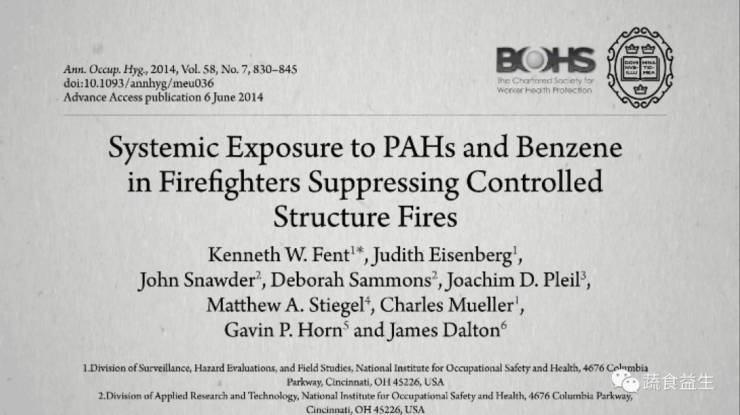 Fent KW, Eisenberg J, Snawder J, et al. Systemic exposure to PAHs and benzene in firefighters suppressing controlled structure fires. Ann Occup Hyg. 2014;58(7):830-845.