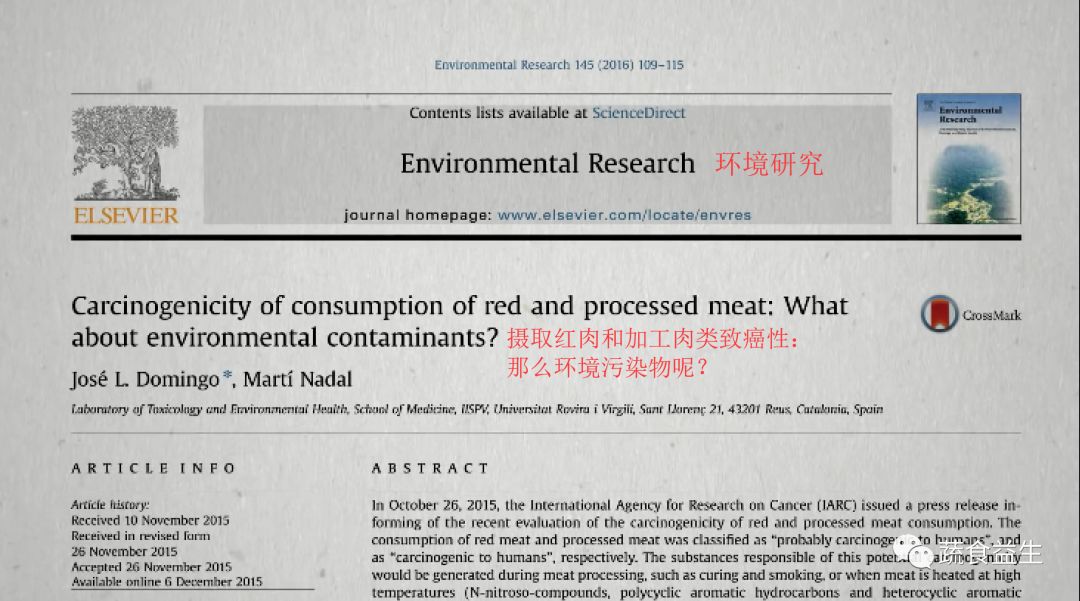 Domingo JL, Nadal M. Carcinogenicity of consumption of red and processed meat: What about environmental contaminants?. Environ Res. 2016;145:109-115.