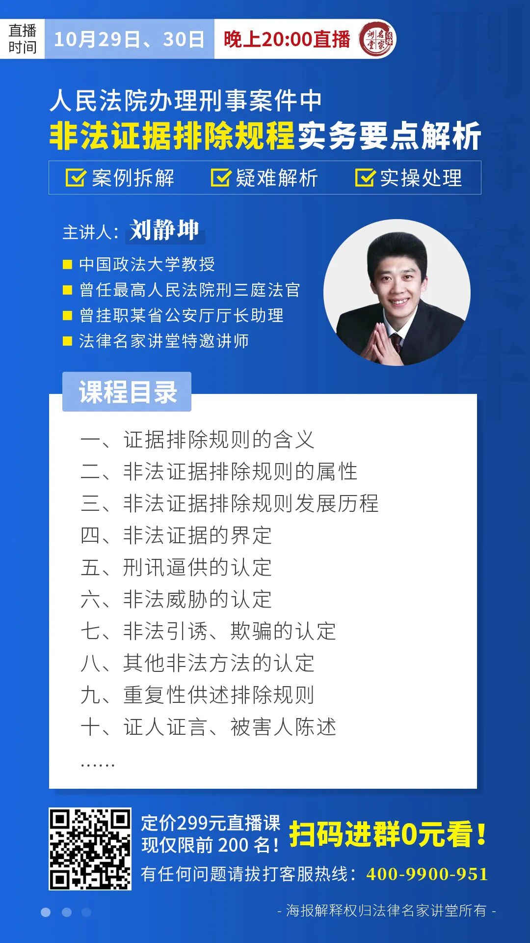 为了帮助大家掌握“三项规程”下的新刑辩理念与技巧,10月29、30日20:00,法律名家讲堂特邀到证据法专家、中国政法大学教授、曾任最高人民法院刑三庭法官刘静坤老师,为大家直播分享“人民法院办理刑事案件中非法证据排除规程实务要点解析”。