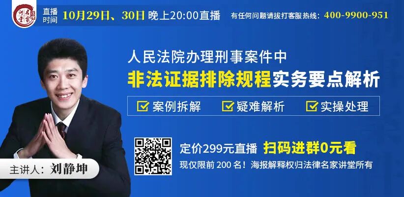 在直播间,刘静坤教授将结合多年的实务经验和典型案例,为大家讲解举证责任的分配原则、庭前对非法证据排除申请的审查和处理、庭审阶段对证据合法性争议的处理等实务要点问题,机会难得,赶快预约观看吧!![]()