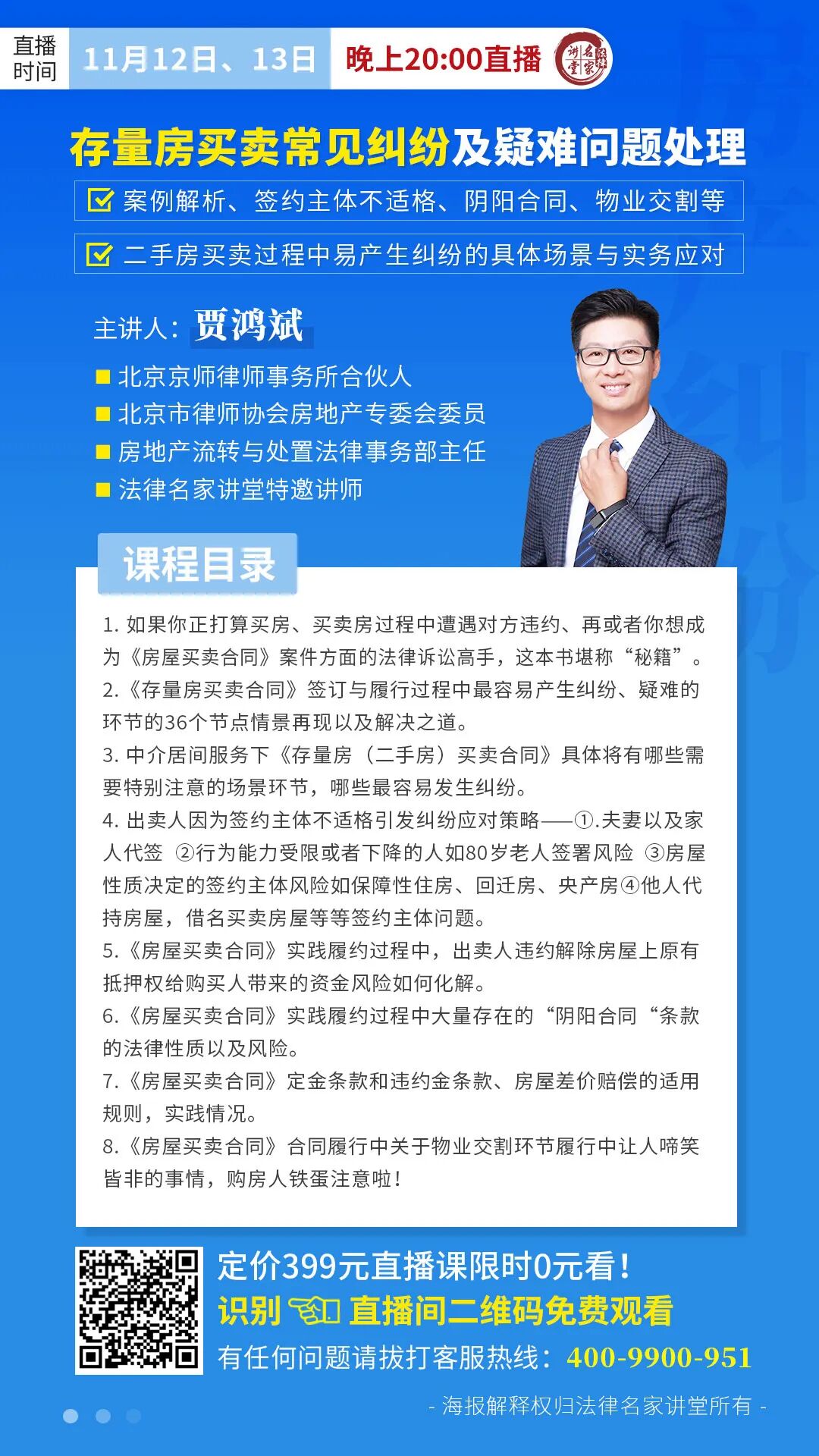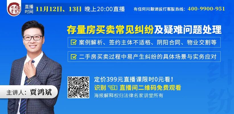 在直播间,贾鸿斌律师将结合真实案例二手房买卖过程中,签约主体不适格、阴阳合同、物业交割等易产生纠纷的具体场景与实务应对。