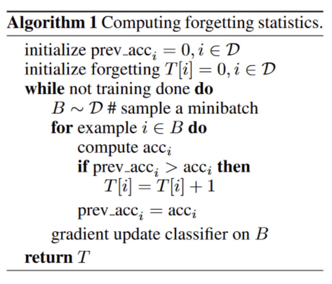 上述统计算法更加清晰地告诉我们本文是如何进行对forgetting events进行统计的,即我们是在每个batch训练完之后统计一次。