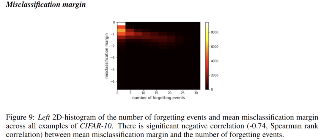 上图是一个2D的直方图,代表了所有样本是如何分布的。总体上看,forgetting次数多的样本,其misclassification margin也很大。