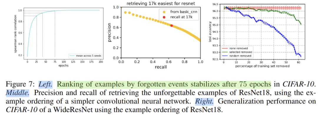 最右边那个图,是使用ResNet18来对forgetting events进行统计,然后使用这个统计结果,不断删减训练样本,在更大型的模型WideResNet上进行训练的结果,发现依然可以删除30%的数据还能保持性能基本不变,这说明,我们可以使用轻量的模型进行遗忘现象的统计,来辅助重型模型的训练。