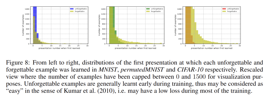 一个样本究竟出现几次才会被模型学到?这是一个很有意思的问题,作者分别对unforgettable和forgettable的样本进行了统计: