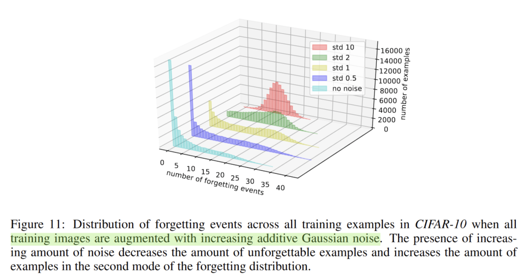 发现,对样本(图片)添加的noise越大,这个forgetting的统计就越接近一个正态分布,这也一定程度上反映了分类任务越难,样本遗忘的情况就越严重。