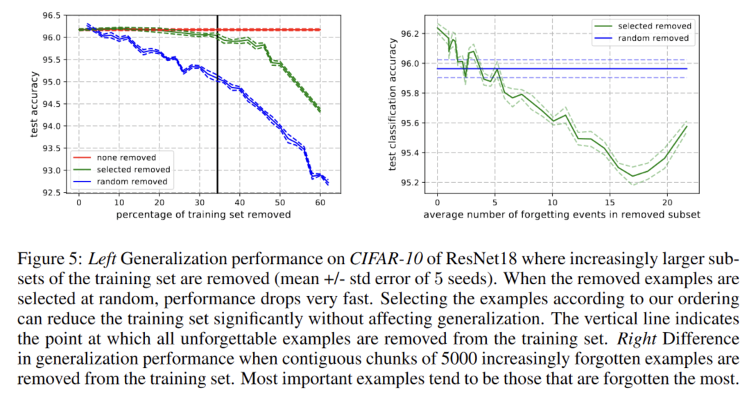 右图则是同样去除5000个样本,但是改变这5000个样本中平均被遗忘次数。可以发现,大体上,包含的forgettable examples越多,效果越差。但是有意思的是存在一个明显的拐点,当forgettable examples达到一定比例时,效果又会抬升一点。作者解释,这说明数据集中可能存在某些异常点或者错误标注的样本(outliers or mislabeled examples),把他们去掉了对模型有好处,但这些样本往往被遗忘次数也很多。
