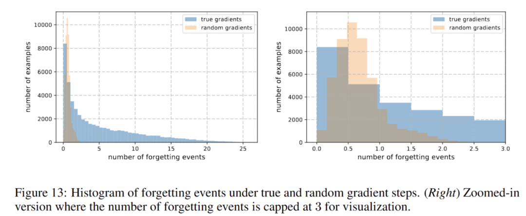 另外,有些样本遗忘,可能是随机发生的,就是模型自己随便更新都可能造成遗忘,所以作者们专门做了一个统计,让模型用随机的梯度来更新,看看遗忘的情况: