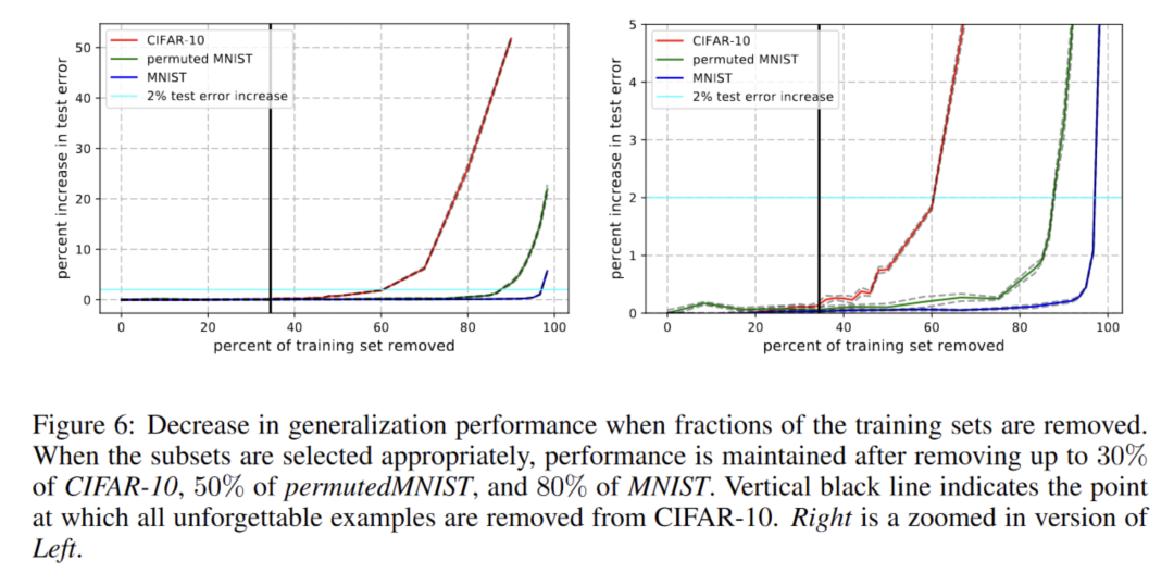 这个图则对比了三个数据集,对比发现MNIST,permuted-MNIST和CIFAR-10可以分别移除高达80%,50%,30%的训练样本且几乎不影响性能。