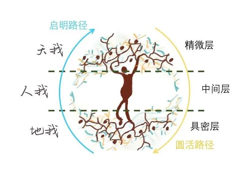 譬如:天我在共振密码体系里指的是对带有高维能量的自我的觉知和构建,通向天我的路径有想象力、审美、梦想和人生使命。地我指的是对带有生物性智慧和原始生命力的自我的觉知,通向地我的路径有本能反应、欲望和情感。人我指的是对社会性的自我的觉知和构建,也就是对我们的社会角色的觉知和构建,通向人我的路径有心智和认知。当我们培养整全性的自我意识,我们可以让觉知在天地人之间充沛丰盈地流动。