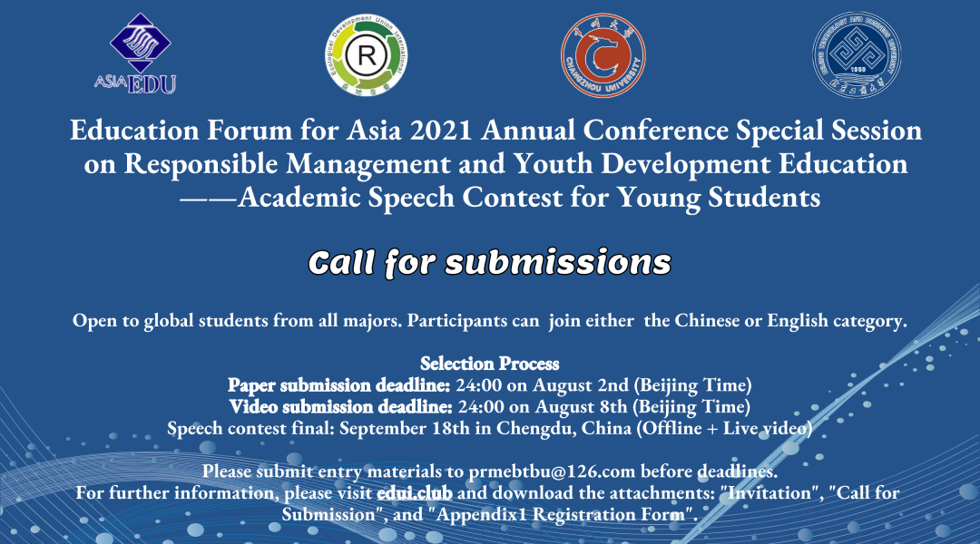 Under the guidance of China-ASEAN Environmental Cooperation Center and the Center for Environmental Education and Communications of Ministry of Ecology and Environment as well as the great support from Education Forum for Asia and Ecological Development Union International, Chinese higher education institutions have responded to the Principles for Responsible Management Education (PRME) initiated by the United Nations Global Compact and the Carbon Neutral Science Technology and Innovation Action Plan for Higher Education released by the Ministry of Education in July 2021, and have therefore launched the 1st Youth Responsible Management and Development Education Academic Speech Contest. This event has received great engagement and support from many universities, colleges, businesses, social organizations and media. Co-hosted by Changzhou University and Beijing Technology and Business University, and supported by many co-organizing institutions including: Peking University Shenzhen Graduate School, International Business School Suzhou at Xi’an Jiaotong-Liverpool University, Shenzhen Finance Institute (CUHK-SZ), School of Design of South China University of Science and Technology, Beijing Institute of Technology-Zhuhai, Polus International College, China Sustainability Tribune, Corporate Citizenship in Action, Green Light-Year, Hainan ShengDian Information Technology Co., Ltd., this event, with invited professors and experts from Chinese Academy of Social Sciences, Chinese Academy of Sciences, Tsinghua University, Peking University, Renmin University of China, Central University of Finance and Economics, Nanjing University, Tongji University, Zhejiang University, Fudan University, Shanghai Jiaotong University, China Global Philanthropy Institute, Sichuan University, Beijing University of Technology, is organized as a Special Session on Responsible Management and Youth Development Education at the Education Forum for Asia 2021 Annual Conference to be held from September 18-19, 2021 in Chengdu, China. This Special Session, organized in a hybrid pattern with both online and onsite speeches, will provide keynote speeches by senior experts as well as a youth speech contest to illustrate the meaning and significance of responsible management education and sustainable development.