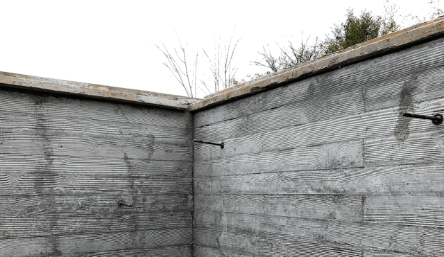 项目从 2017年9月份开始施工,2018年8月整体拆模,历时近一年,设计工作贯穿着整个施工过程,建筑师希望在大尺度的山水环境中突出材料相对强烈肌理感,在正式浇筑前,经过多次实验,选择了纹理较为清晰但成本并不高的碳化木板作为模板。为把控施工效果,采用同一模数错缝拼装的折中模板方案。施工完成后,建筑师刻意保留了一些瑕疵,希望手工建造的痕迹能被感知。