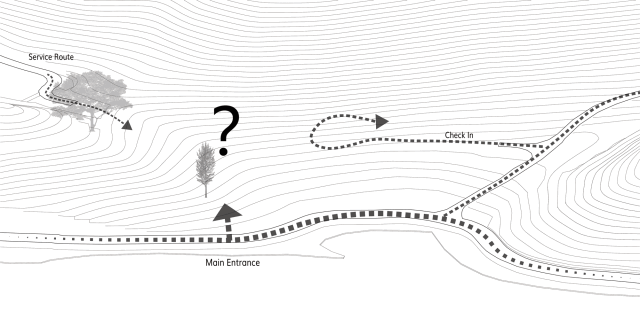 河边的杉树与坡上的樟树,分别作为入口提示,坡下围绕杉树做了圆形的院子,入口处通过片墙延伸,将空间蔓延至周边,模糊了建筑与自然的边界。这样“双入口”的设计也是建筑师在业主功能不能明确的情况下,保证未来使用灵活性的一种应对策略。