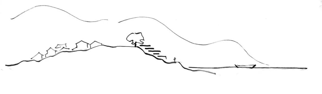 设计利用地形高差,将茶舍与接待两个功能,分为主次两栋贴合地形延展的退台建筑,逐层叠退,不仅视觉上弱化建筑体量,同时产生了大量的一线江景的露台场所。主楼实际为三层,为保证更好的景观视野,将整个建筑体量由高向低逐层下挂。顶层地面标高与后山平齐,与村落相接,底层通过两层毛石垒砌的灰空间与滨水道路相连,有效减少行人对使用空间的干扰。