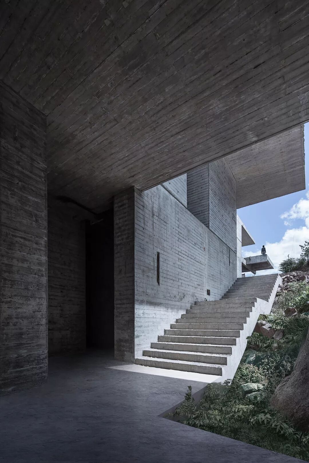 沿着毛石砌筑护坡拾阶而上,建筑体量隐藏在山坳中,沿江面展现的是数层宽阔的观景平台,来访者在深远的挑檐下几经转折,视线在江面与临山楼梯间转换,空间时而开阔时而幽狭。