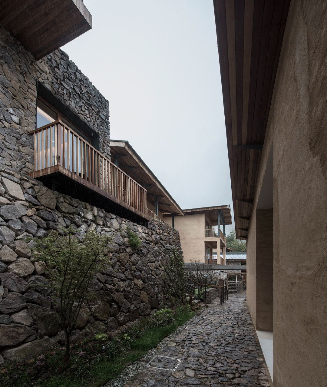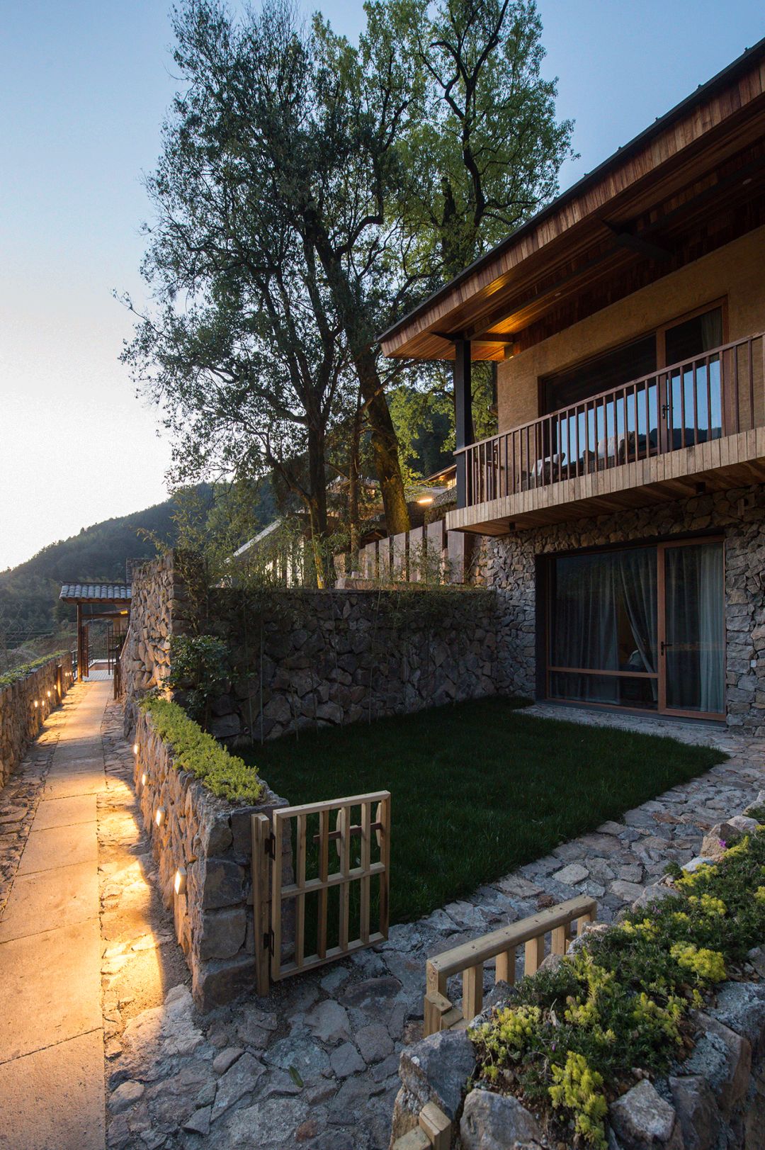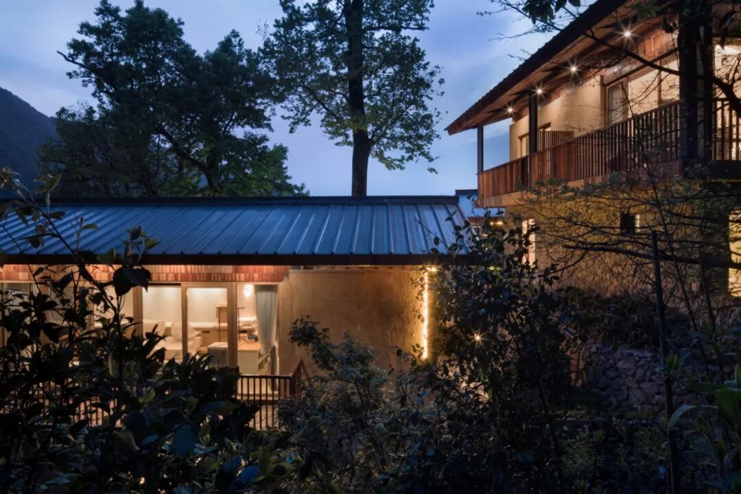 客房提取坡屋顶形制,材料以当地毛石和夯土为主,延续传统生活与文脉。在这里,并没有宏大叙事的建筑空间,也没有昂贵繁复的材料做法,材料与形式的有机结合,每一栋山舍的夯土、垒石、小青瓦,是建筑材质,是立面造型,更是山里的生活。