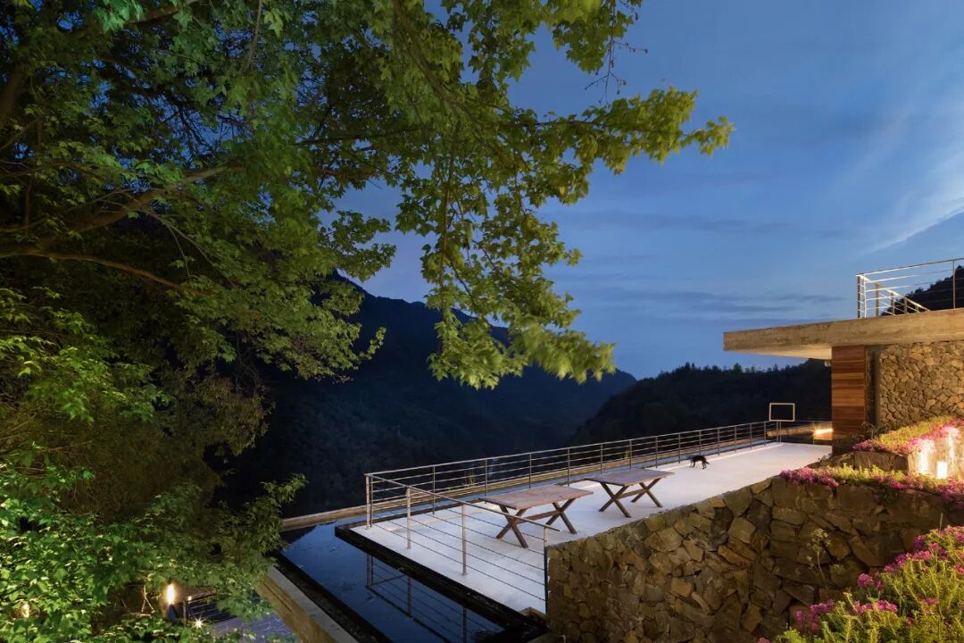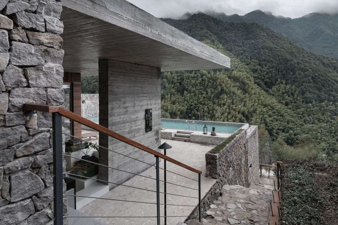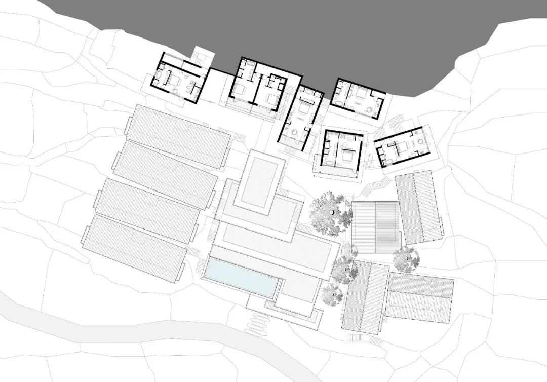 33间客房,配备接待大堂、图书阅览、餐厅厨房、恒温泳池的公共区域,2688㎡的建筑面积,对于一个山间民宿无疑已是巨大的体量。设计以一层或两层的客房错落有致地散落山间,四层公区以片层形式贴合地形延展,弱化体量的同时,创造出一系列观景露台。各层建筑的顶面和地面与不同高度的山体衔接,层层展开,建筑如从山中生长出来,以最轻柔地方式贴合于山地,隐现于景观。