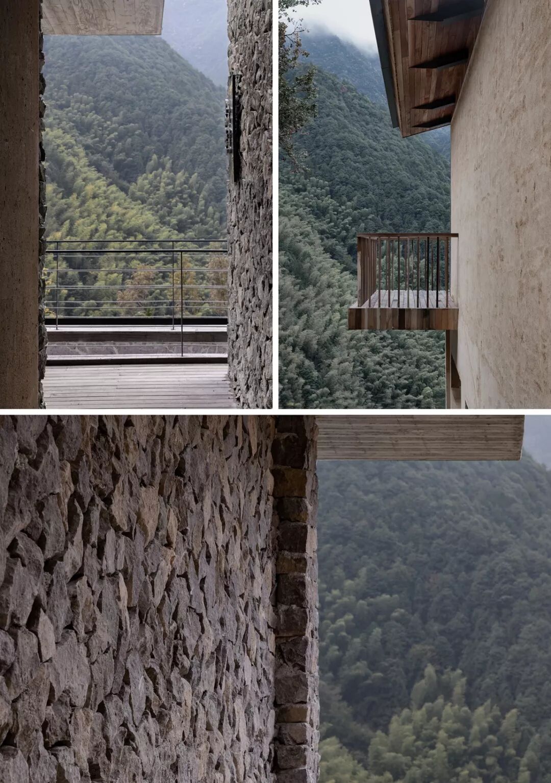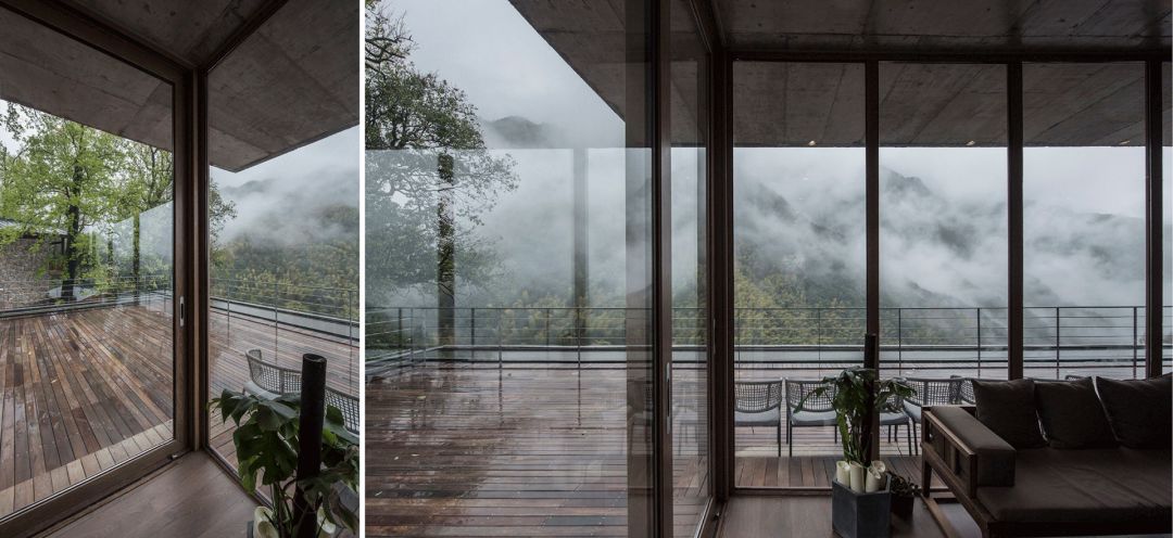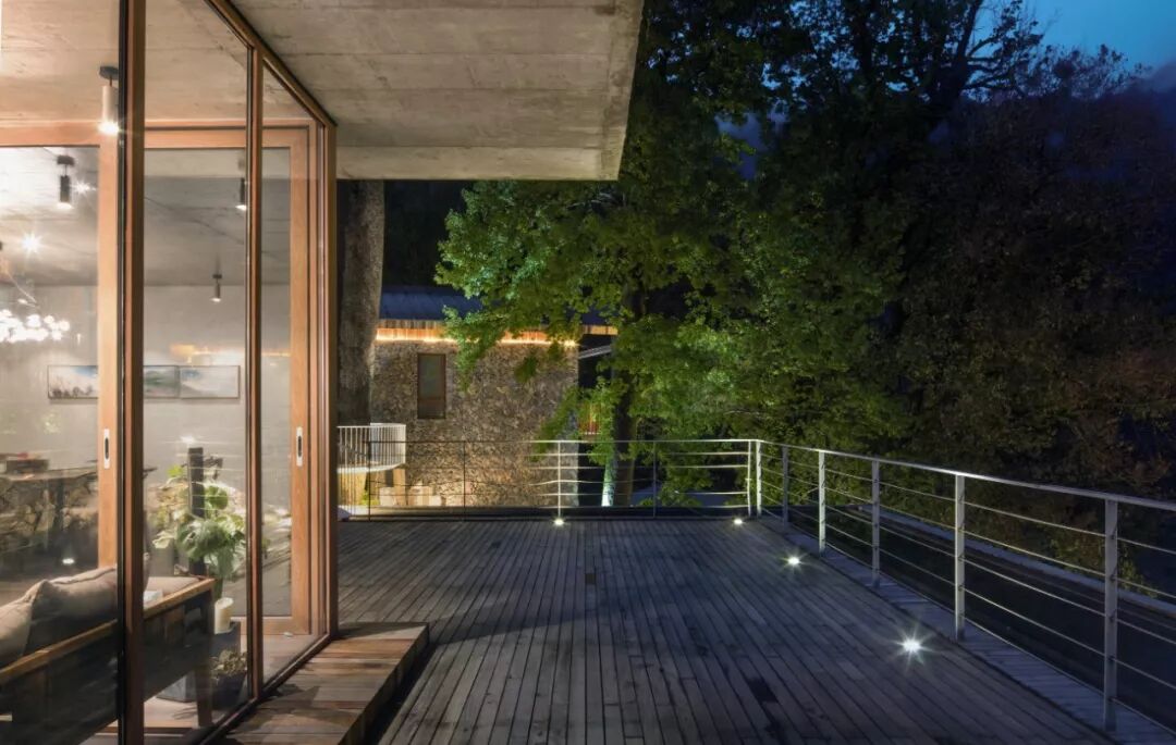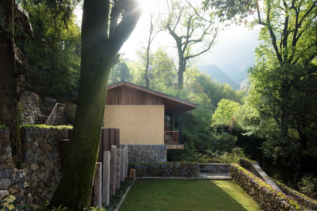 由毛石砌筑的台阶拾级而上,巧妙的动线设计让来访者的视线在远山和背山间迂回。爬坡、仰望、转折、远眺,在空间里营造步移景异、曲径通幽的游山之趣。建筑背山面谷,卧于一方宝地,树木遮掩,若隐若现,远山美景可观、百年古樟为邻,透过不同的窗口,在不同的时间里,在不同的建筑高度,都是不同的风景,每一个层次都有不同的体验,每扇窗口外都是整幅无框山野画卷。