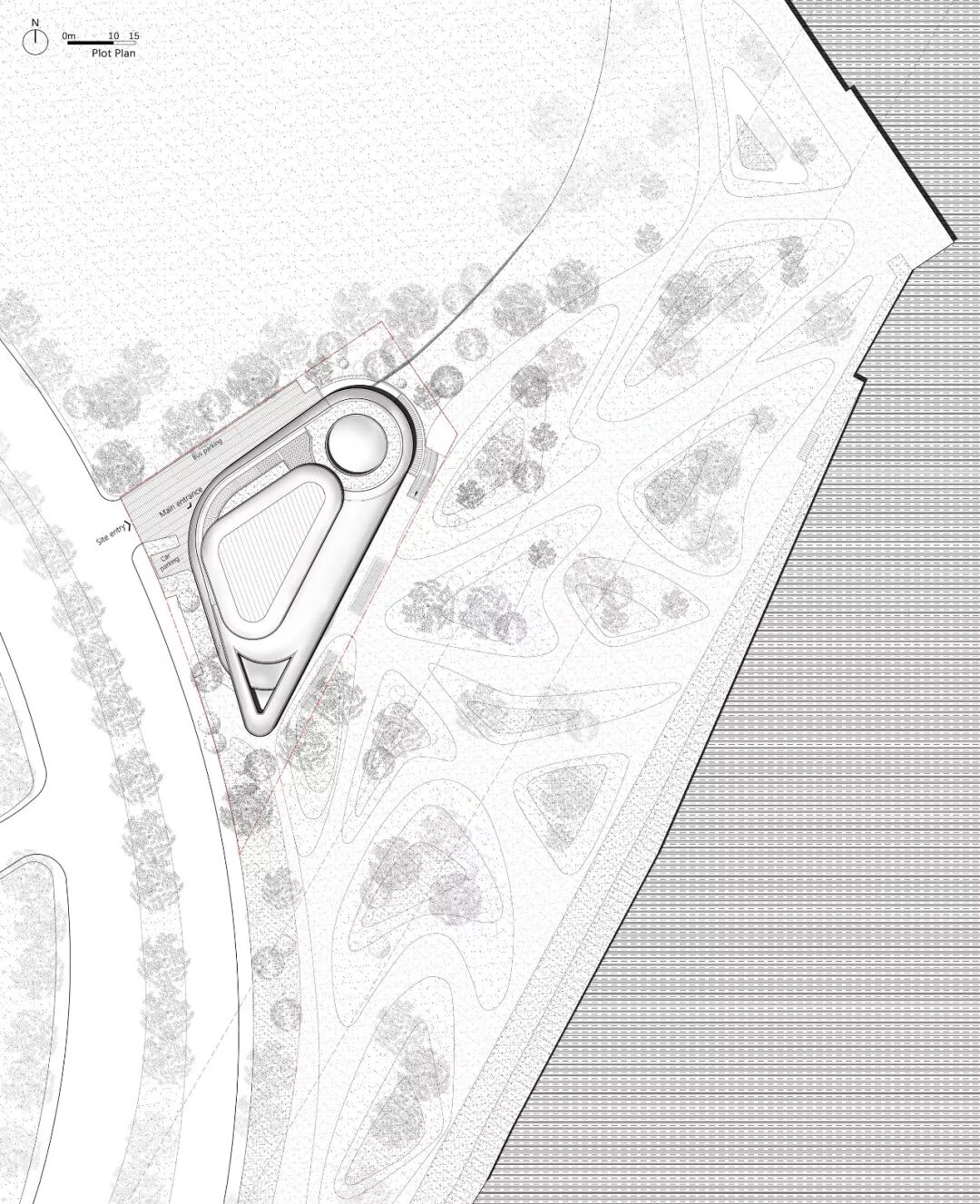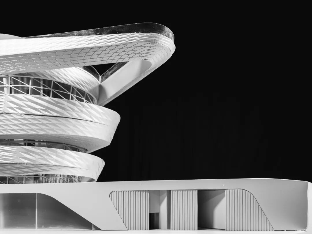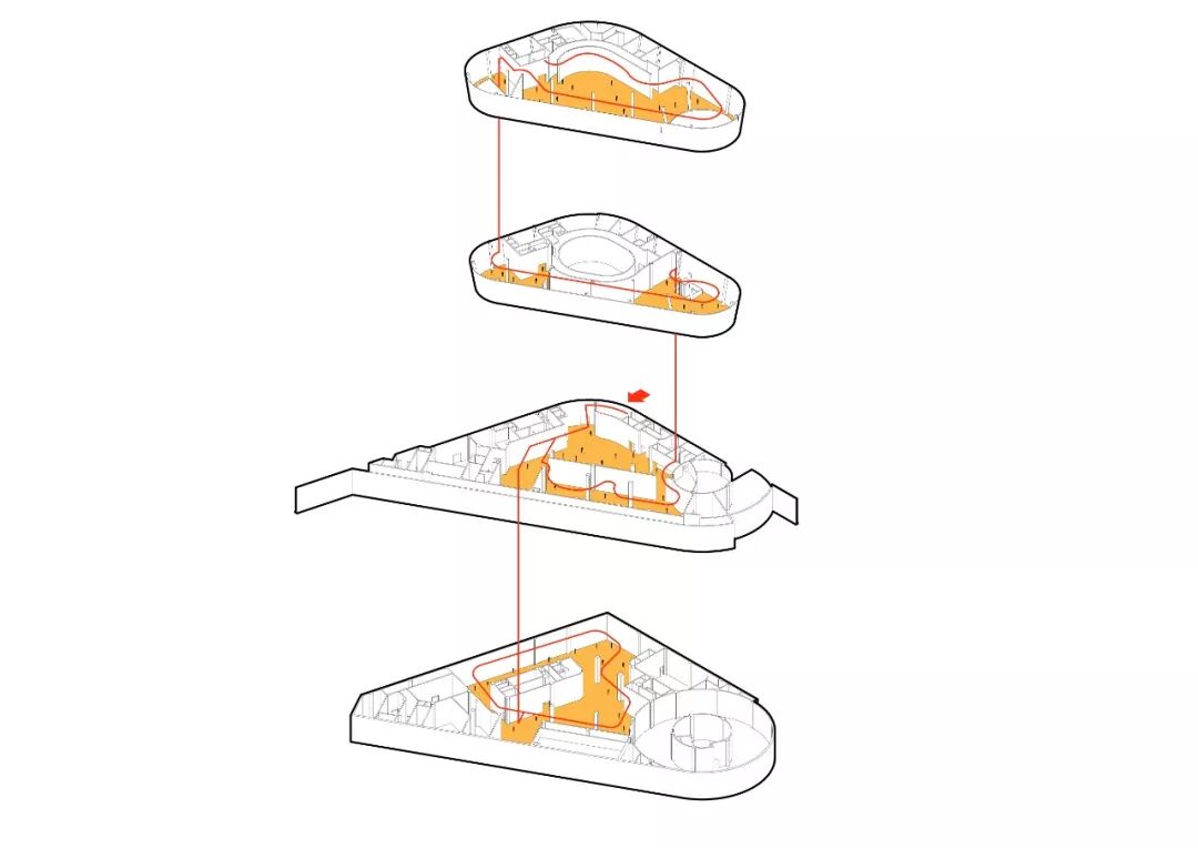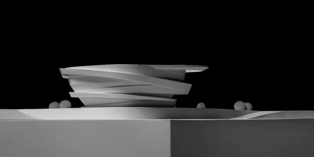面对有限的建设用地,设计通过博物馆内、外两组流线的组织,推导出盘旋交织下小上大的倒圆台建筑形式,为底层留出充分公共空间和回旋场地的同时,也顺势在视觉上形成了如多股水流盘旋交织而上,建筑由水而生的识别性。