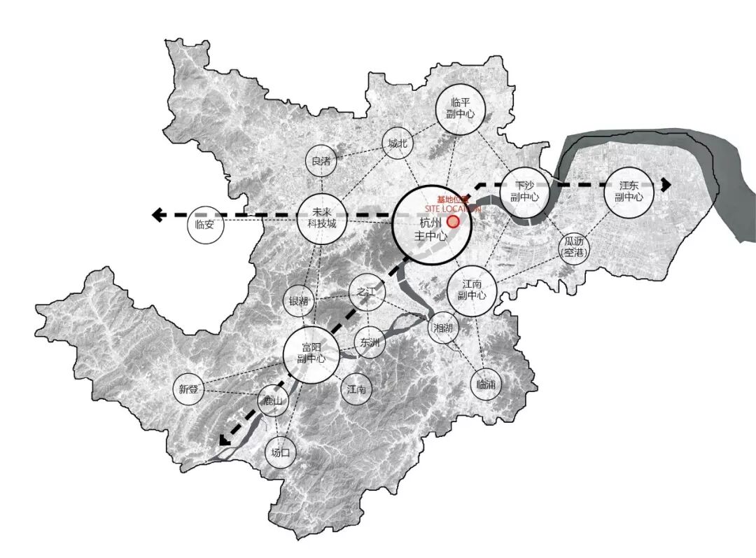 一方面,场地处于世界文化遗产——京杭大运河的南端起始点,杭州两大母亲水系——京杭大运河和钱塘江在此汇流。大运河始建于春秋时期,流经富庶儒雅的钱塘古地,记录繁华古都的沧桑沉浮和白墙粉黛的市井百态;钱塘江,古称“浙江”,既是浙江省最大河流,也是浙江一省之名的由来,作为吴越文化的发源地之一,俯瞰东南,纵览古今。两大水系文明交汇此地,是杭州“水”文化象征当之无愧的代表性坐标。