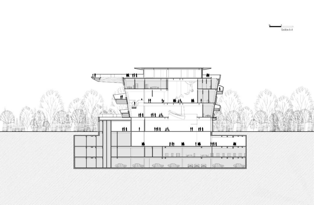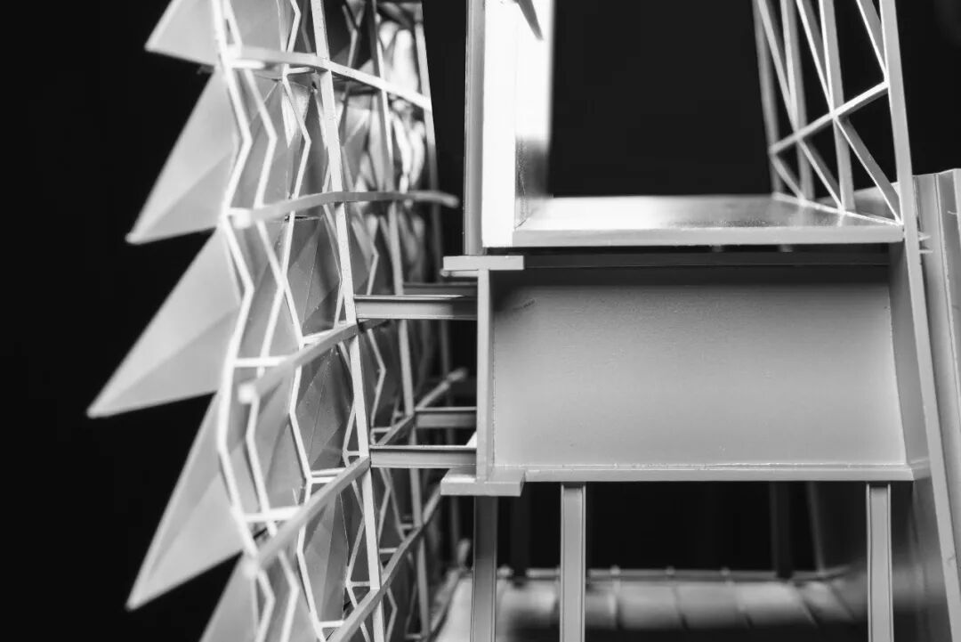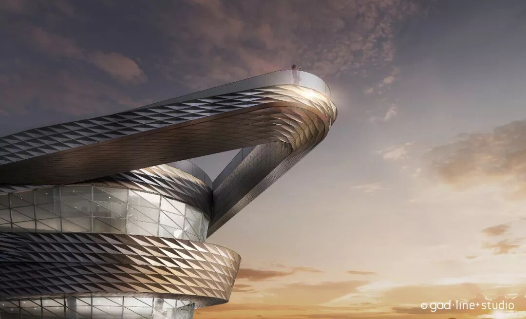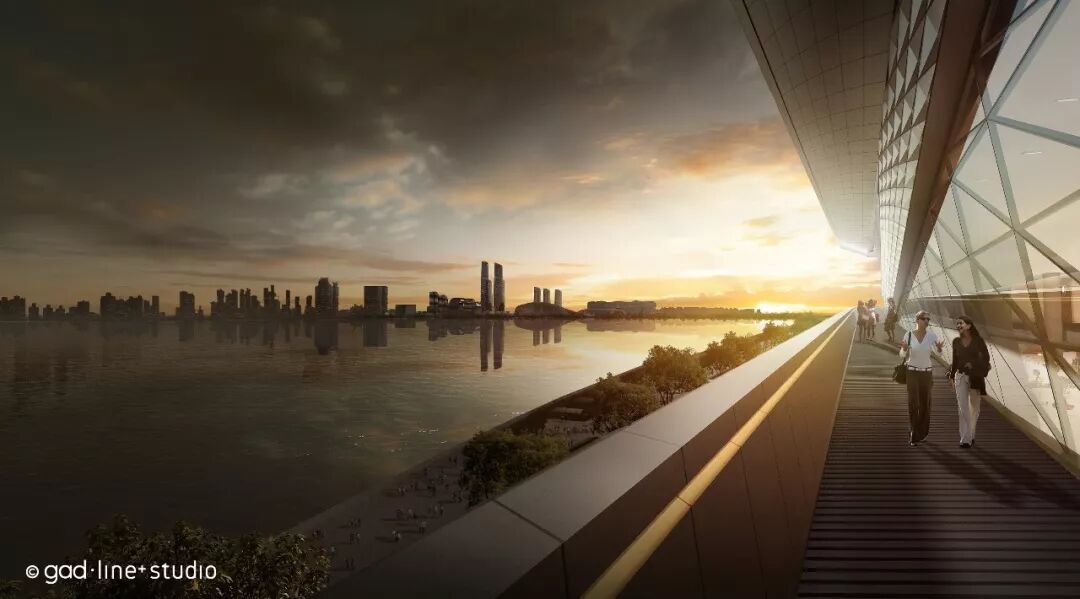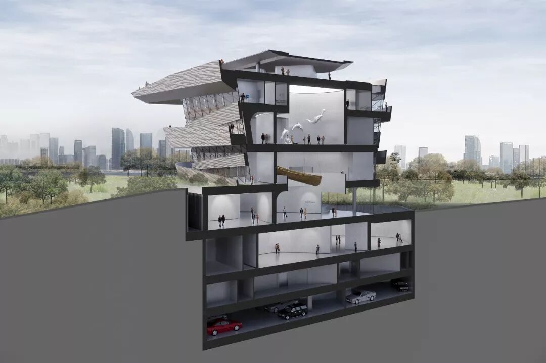 通过螺旋上升的步道,多股不同目的的人流将最终交汇在钱塘江博物馆的屋顶,大尺度的悬挑观景台,则成为了城市的公共空间无限延展的一个象征,博物馆的公共属性也在此得到了进一步的升华。