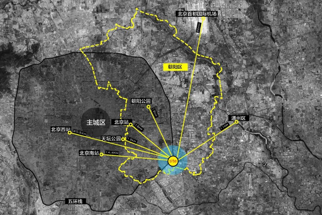 本项目地处北京市东五环东南角,系属朝阳区上位规划的创意文化风貌区,位于主城区和北京副中心之间,南侧紧邻马家湾湿地公园和萧太后河景观带,景观资源良好。但区域周边缺乏硬件和名片,亟需激发城市活力、带动区域发展的全新能量极。