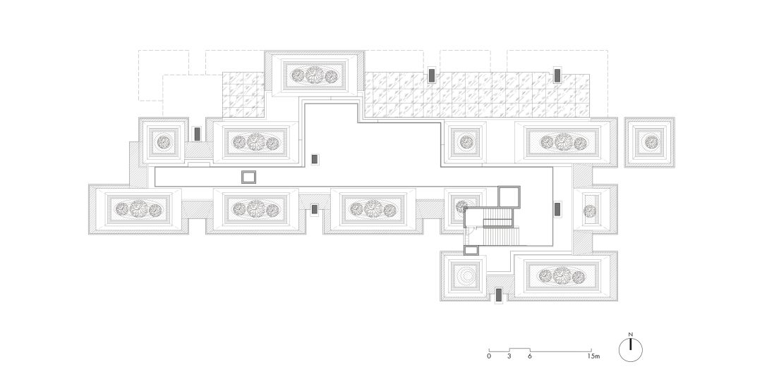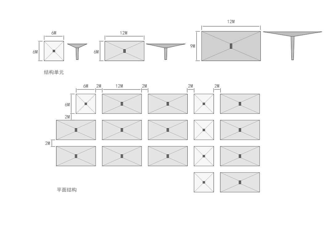 在确定结构原型为基本细胞单元后,我们以3米为基本模数,形成6×6米,6×12米,9×18米三种尺寸的结构单元。设计进一步围绕空间容量的需求,45个伞状结构在满足抗震要求的前提下,统一伞盖边距为2米,并进行有限的连接,再于同一数列模数中进行组合,形成均质的可“生长”的平面。