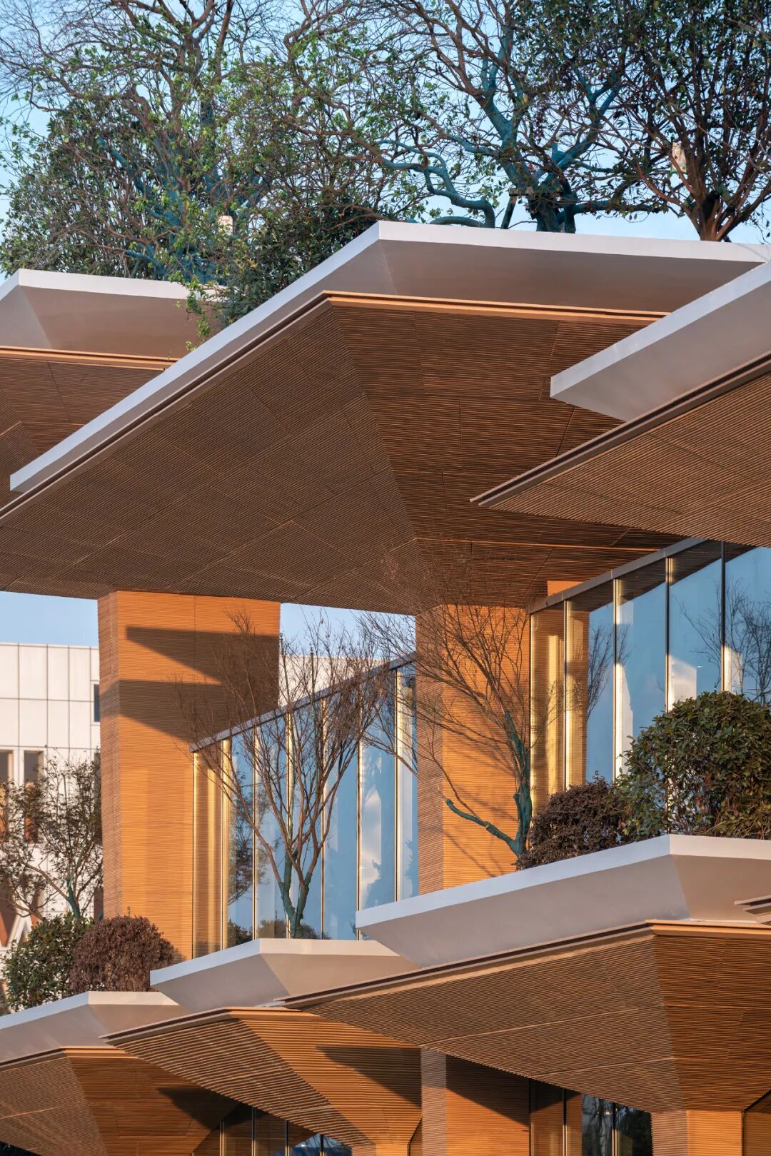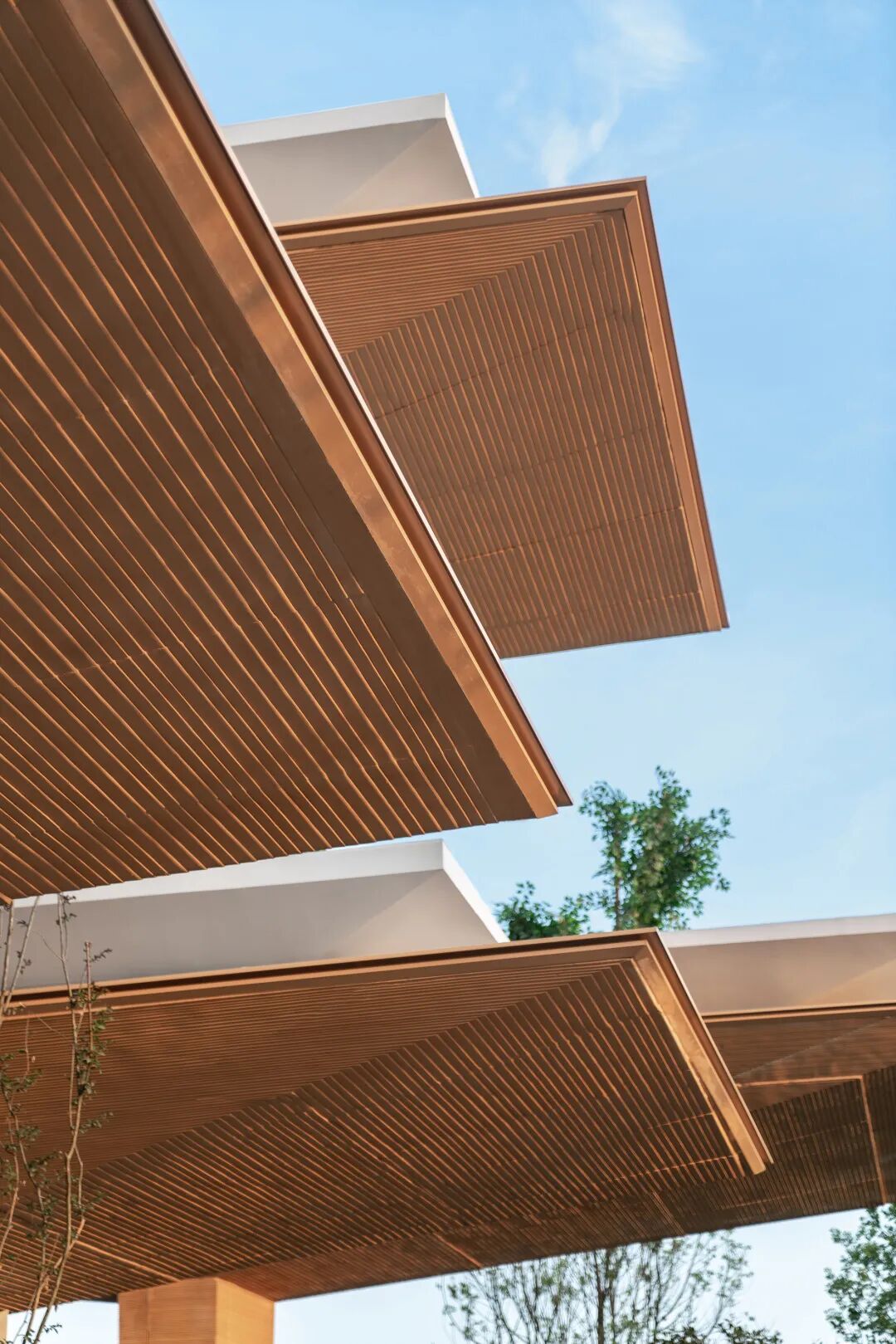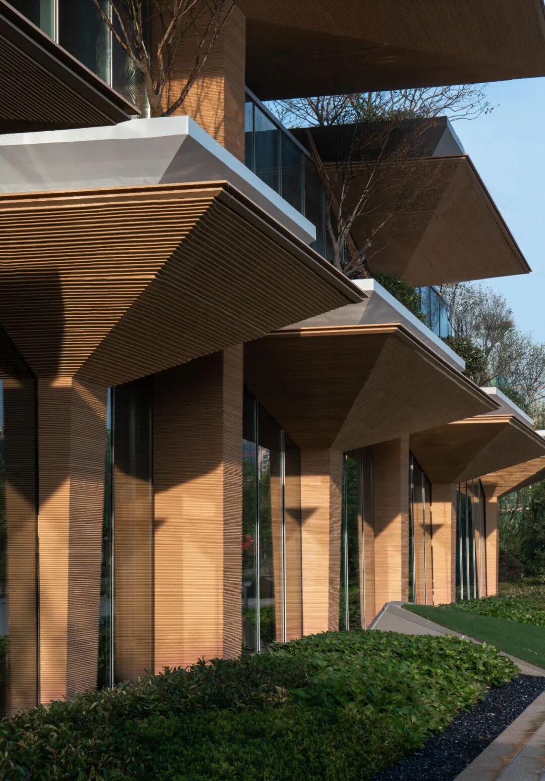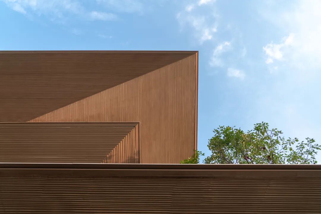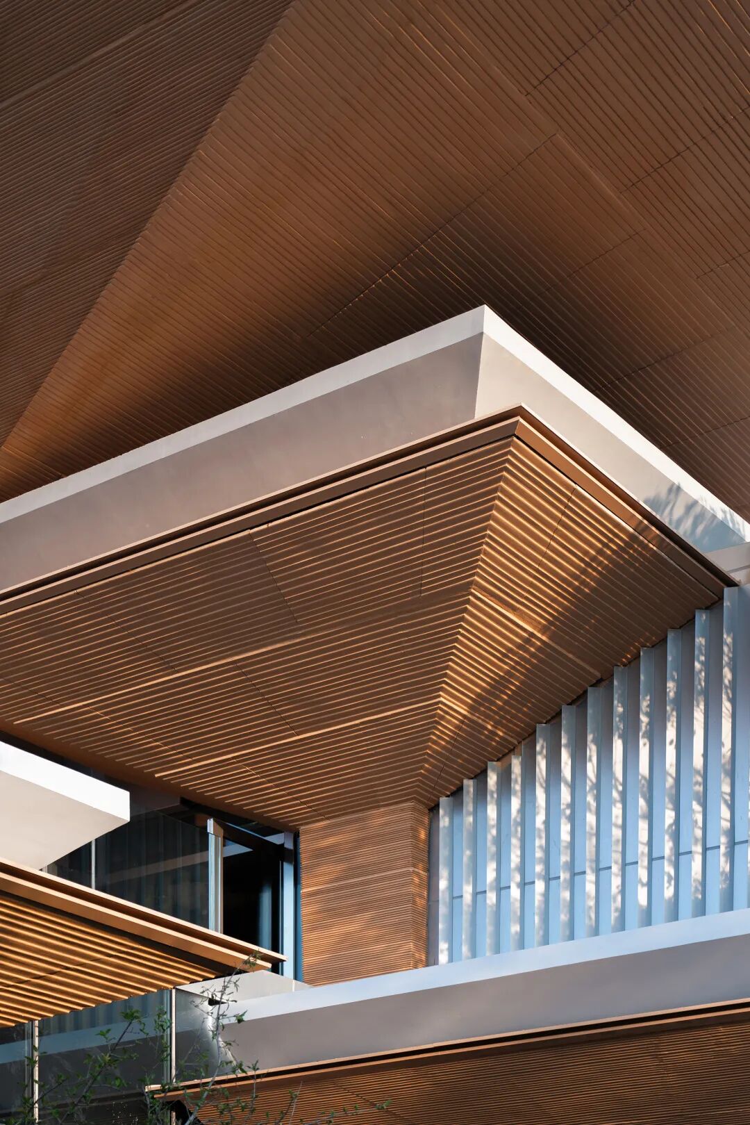 △ 材料分缝GRC挂板的横向肌理遵循横向切片的构建原则,即随着GRC 挂板的倾斜度不同而调节线条宽度和角度,以此保证每道线条的上表面水平、下表面内斜,观感上如同层层横向切片的木纹理。