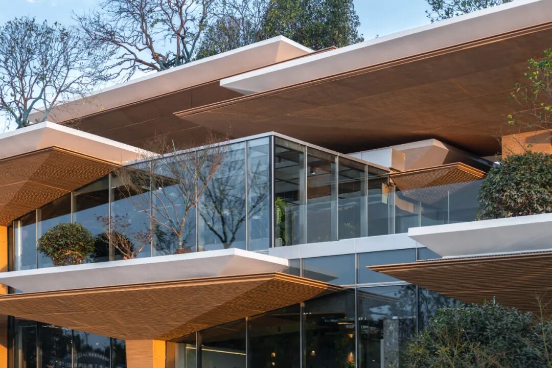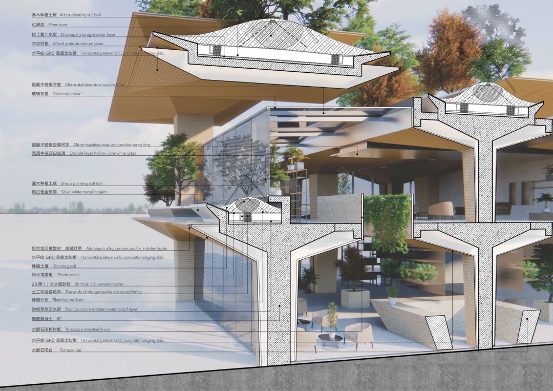 玻璃幕墙基本以T型钢作为龙骨支撑,室内所有隔断包覆镜面不锈钢,连续、消隐的室内界面既弱化杆件的存在感,又强调玻璃面的延伸展示。与伞体交接的玻璃幕墙则将框料和构件隐藏在GRC幕墙的接缝凹槽内,尽可能保证结构的完整性和纯粹性。伞盖在多个标高的错层布置,以及平顶处理,为自然绿植叠加创造了条件。通过在立面、屋顶的覆土及植栽,建筑从外观上呈现出强烈辨识度以及清晰的二元状态——人工的大地色系伞阵与自然的绿植山丘交织融合于一体。生活方式集合店的概念使得室内功能趋向混合,在自组织的结构支撑下,设计消解了室内的几乎全部的墙体,伞柱间的平面形成了一种高度自由的、流动式的空间重组——室内功能跟随空间体验的转换而转换。地面材质选择了同样是大地色系的水磨石,配合同色系的铜质屏风、木制家具和书柜,建筑、结构的边界与室内的界面自然地复合在一起。在复数的、“自由”生长的伞盖群下,多种业态同样自由而错落地分布其中,每一种业态围绕一组伞盖空间展开,伞盖的领域和其下的业态陈列共同形成了有内容的细胞单元,持续地吸引顾客们的到访和驻留。