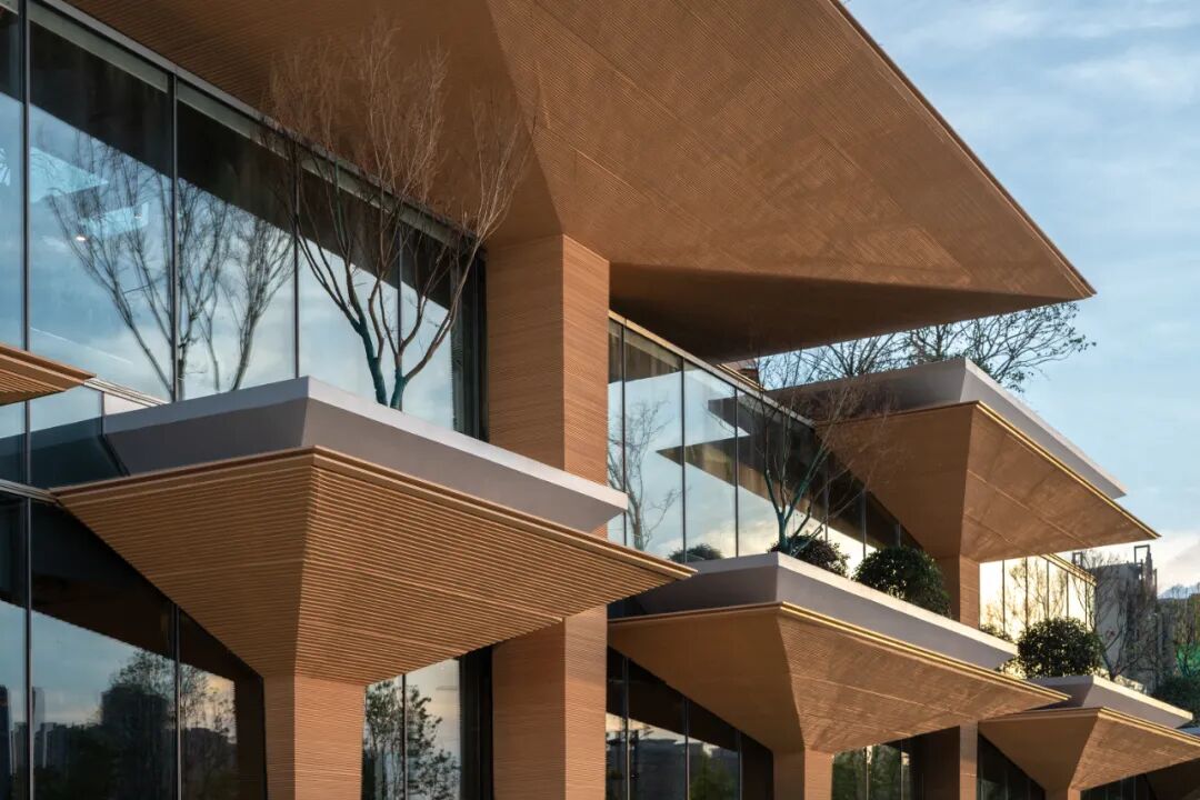与结构互释的是伞状单元的GRC材料肌理,我们为其选择了亲近自然的大地色系,而为了寻求最为合适的GRC肌理密度,历经计算机模拟、3D打印和实物打样等多个阶段的反复推敲,精准控制水平纹理,从而达到层叠的肌理质感。